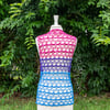 Worked as a basic rectangle with minimal seaming, the top is loose fitting and lightweight, and can be styled in any number of ways. The pattern includes three lengths and nine bust sizes, notes for making it match your flag, and loads of customization options.