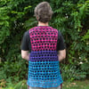 Bi Pride sample used Oink Pigments Disco (fingering weight; 92% sw merino/8% lurex; 405yds/115g), 268yds/78 in Crochet Me a River (blue), 95yds/27g in Sex & Violets (purple), 137yds/39g in Le Pink (pink) to create a size C in hip lengthTrans Pride sample used Oink Pigments Disco (fingering weight; 92% sw merino/8% lurex; 405yds/115g)166yds/47g in Tumbling Turquoise (blue), 130yds/37g in Bunny Slippers (pink), 57yds/16g in Birthday Suit (white) to create a modified top in a kid’s size