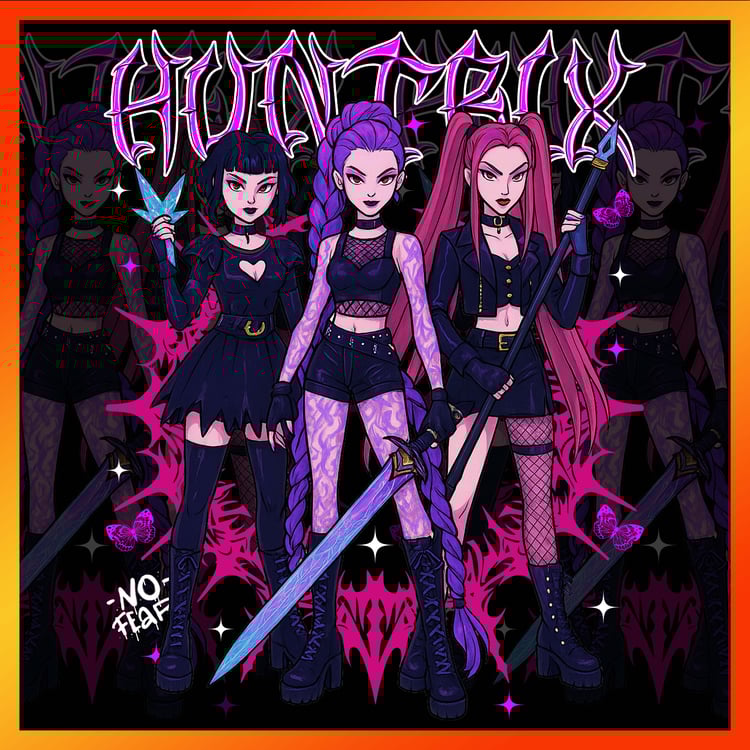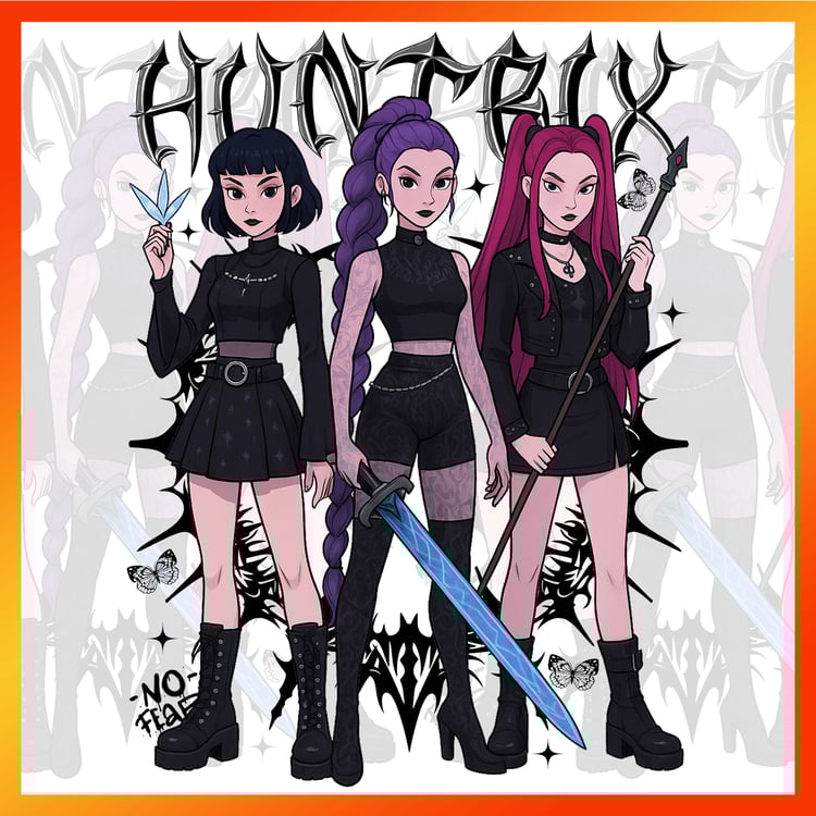 Step into the futuristic world of Huntrix: KPOP Demon Hunters, where fashion, anime, and urban fantasy collide! This exclusive artwork is inspired by vibrant K-pop aesthetics and bold anime vibes, making it perfect for fans, creators, and merchandising designers who want something unique and eye-catching.