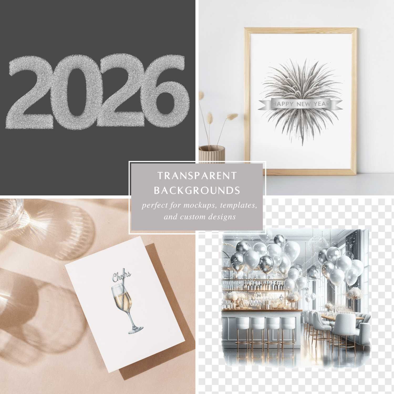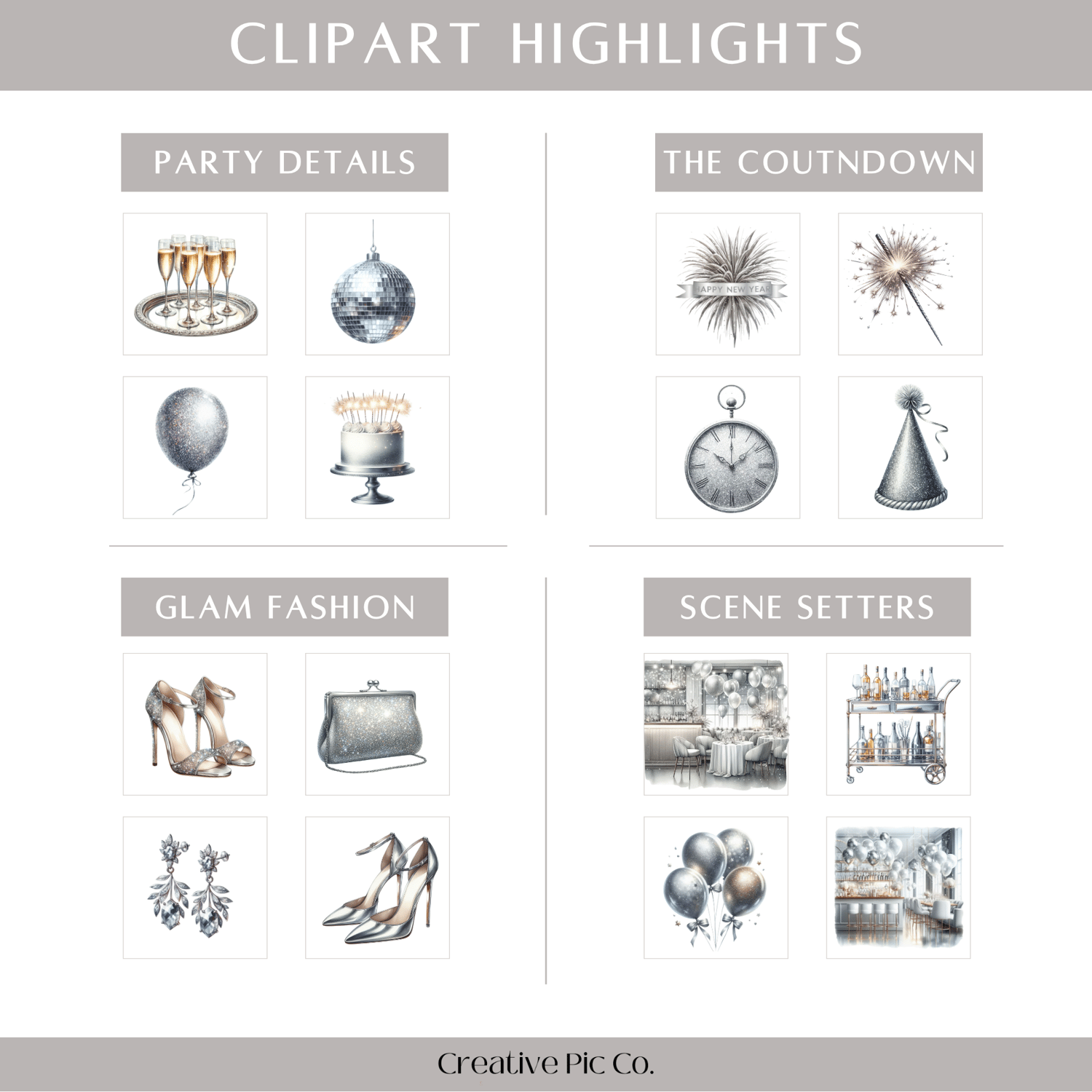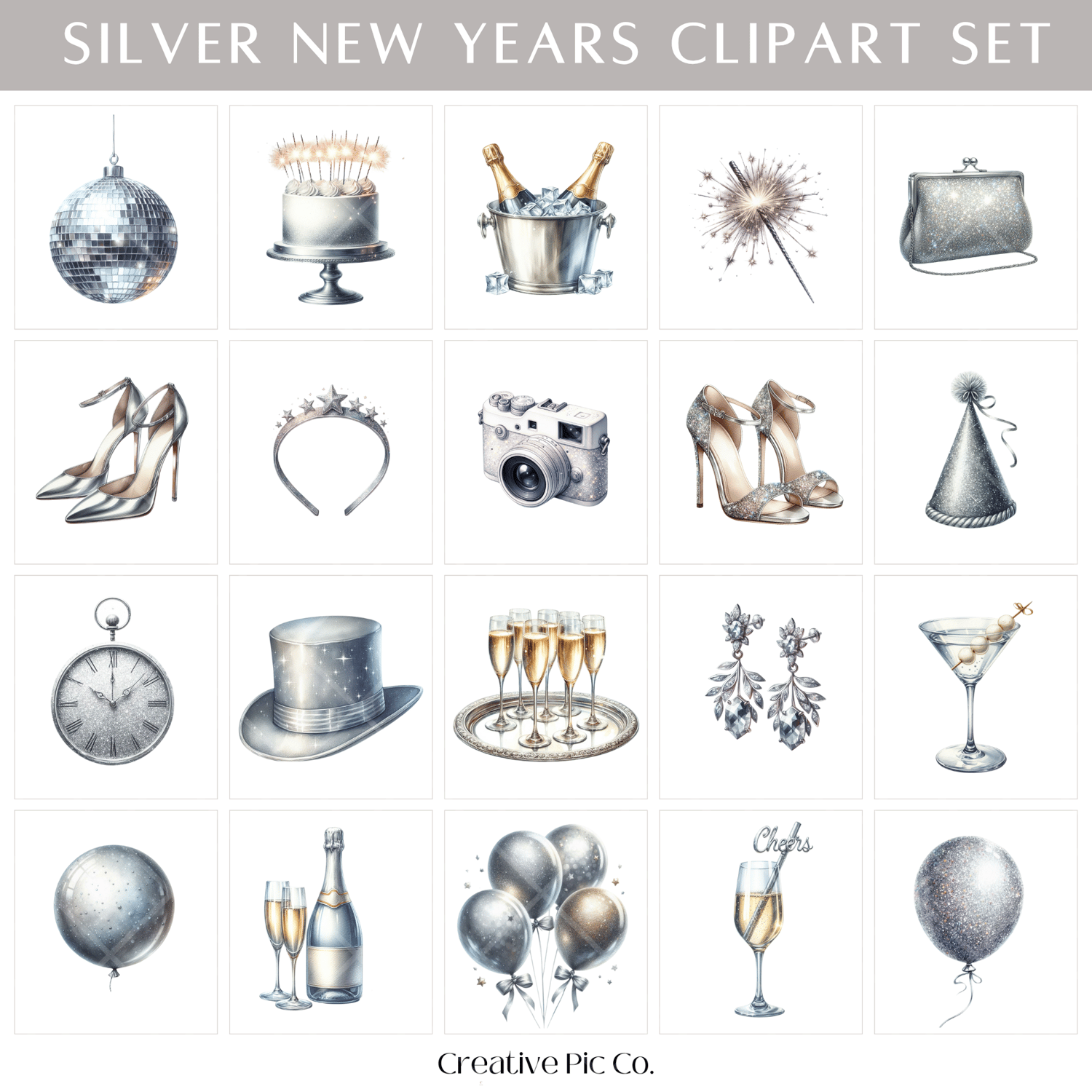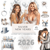 Pop the champagne and shine bright into the new year with the Silver New Year's Clipart Set. This glitzy collection of 45 PNGs captures the sparkle of New Year’s Eve in elegant silver tones featuring party decor, disco balls, glam outfits, cocktails, countdown numbers, and festive scenes. Perfect for planners, party invites, brand content, and everything you need to ring in the new year with style and shimmer.
