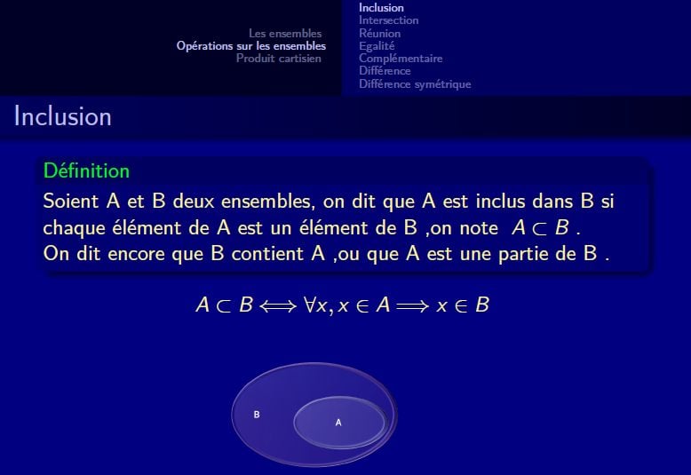 - 🔹 Inclusion et égalité : comprendre comment comparer deux ensembles, déterminer si l’un est inclus dans l’autre, et maîtriser les conditions d’égalité entre ensembles.