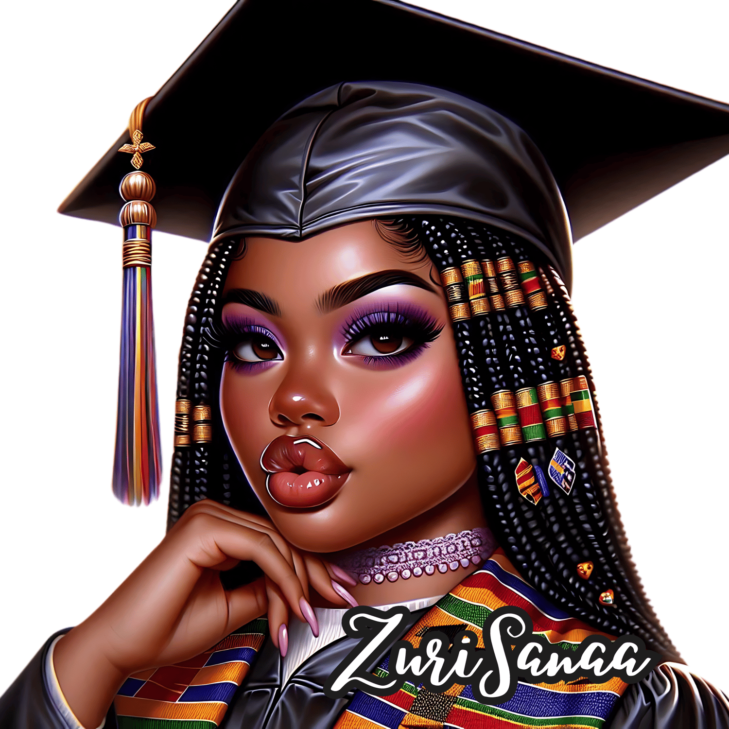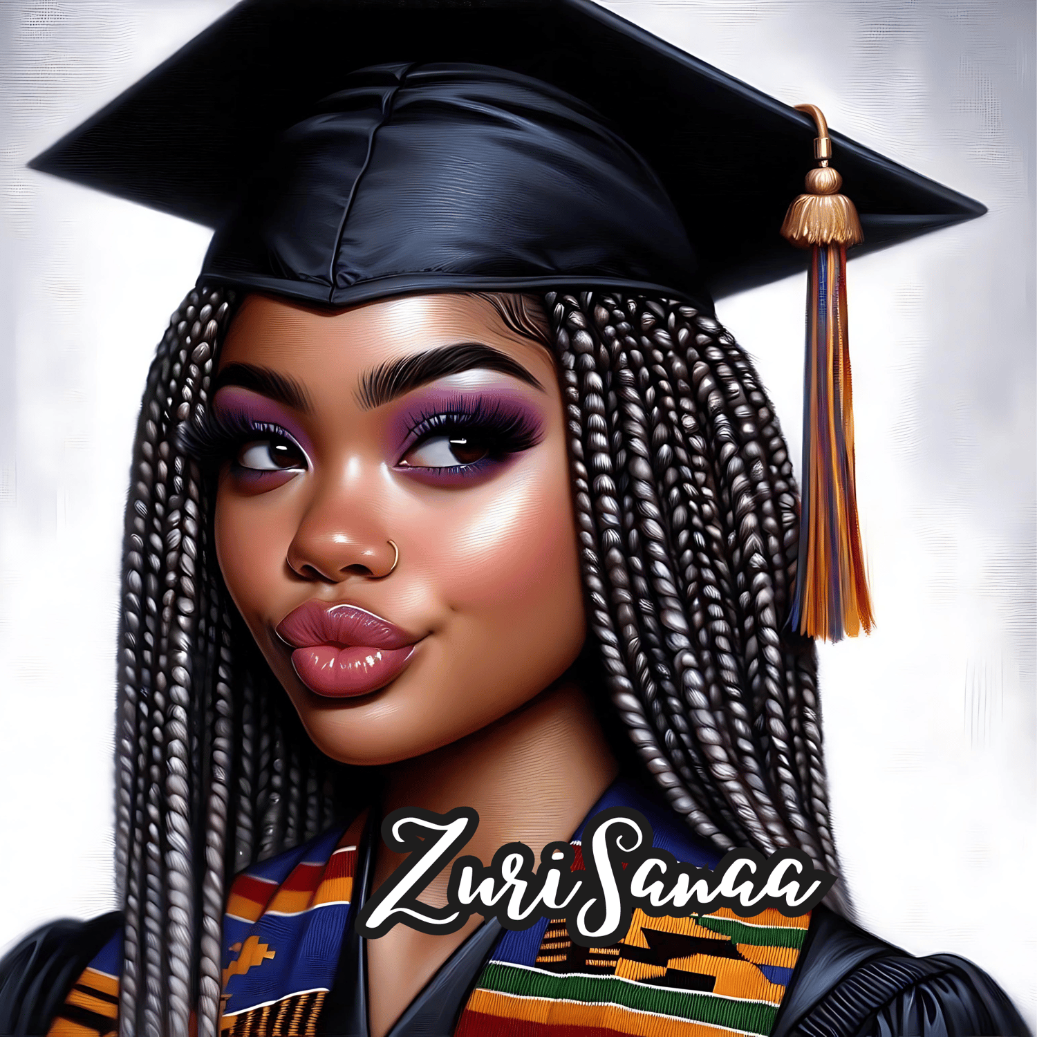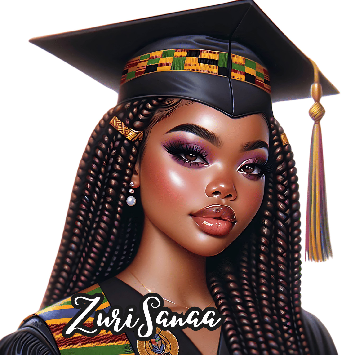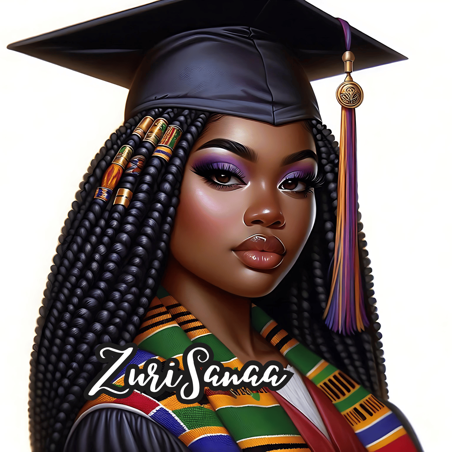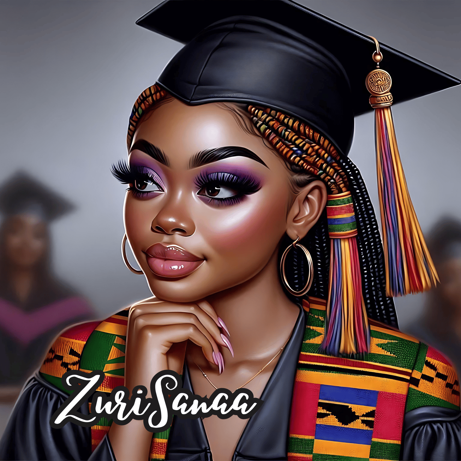- Vibrant & Detailed Artwork: Every detail, from the intricate braids to the striking Kente cloth and graduation regalia, is meticulously rendered, offering a professional and polished finish.