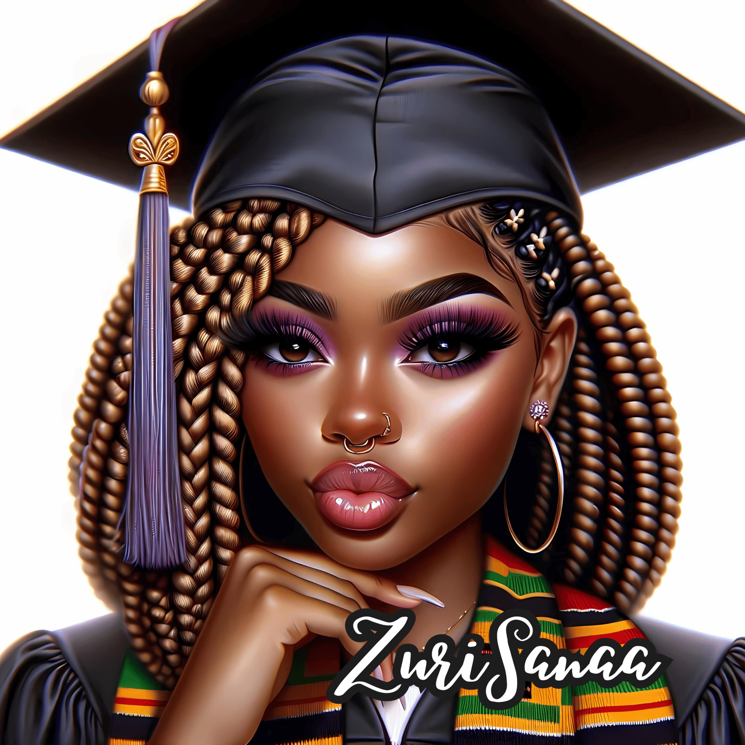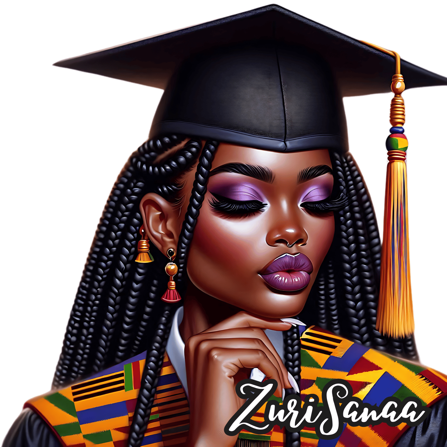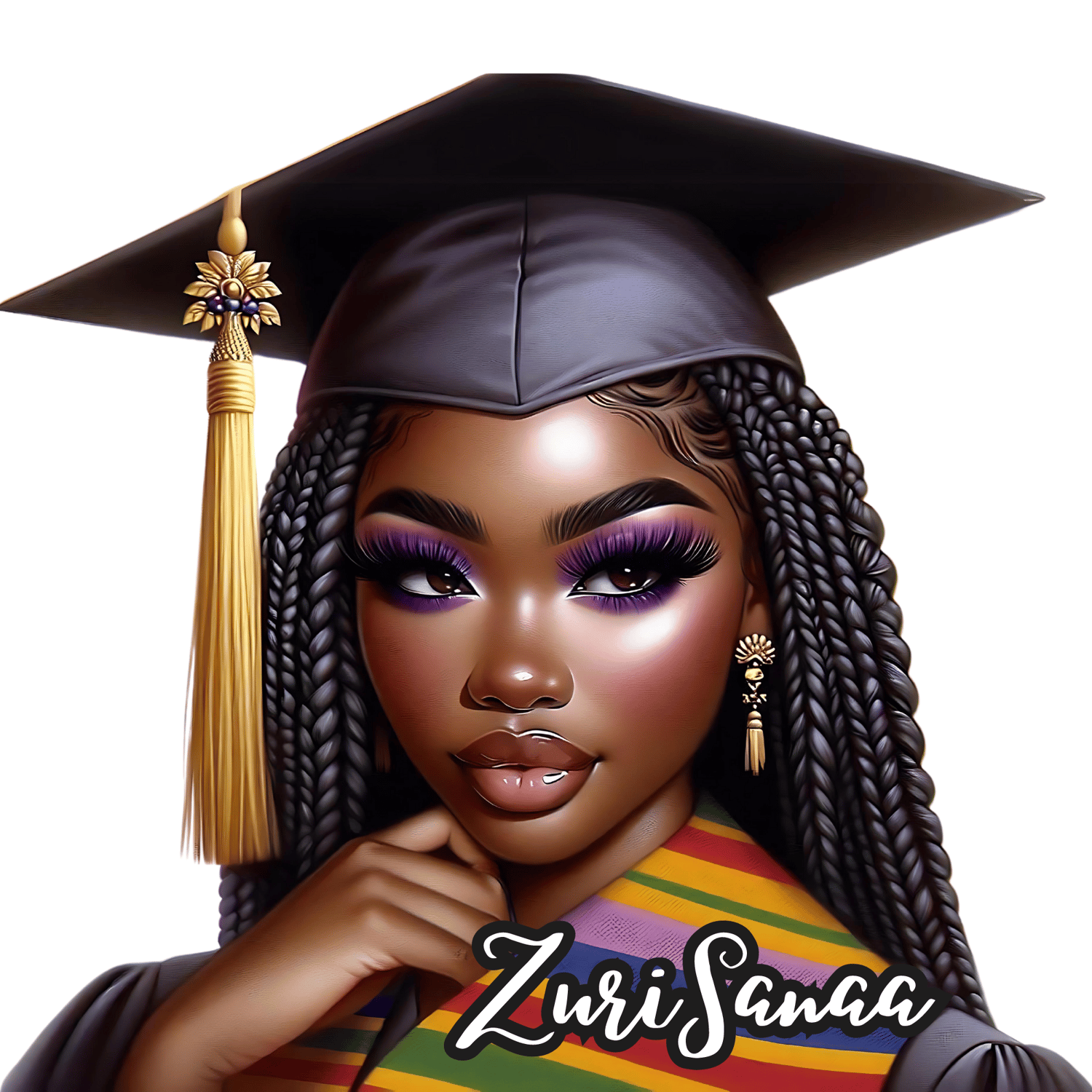 Celebrate the achievements of the brilliant graduates in your life with the "Braids & Grades" PNG Bundle! This unique collection features 10 high-quality digital illustrations inspired by the image of a stunning Afrocentric graduate. Each image showcases a confident and stylish Black woman adorned in her graduation cap, with beautifully braided hair highlighted by traditional Kente cloth accents.