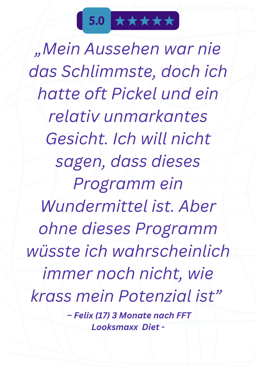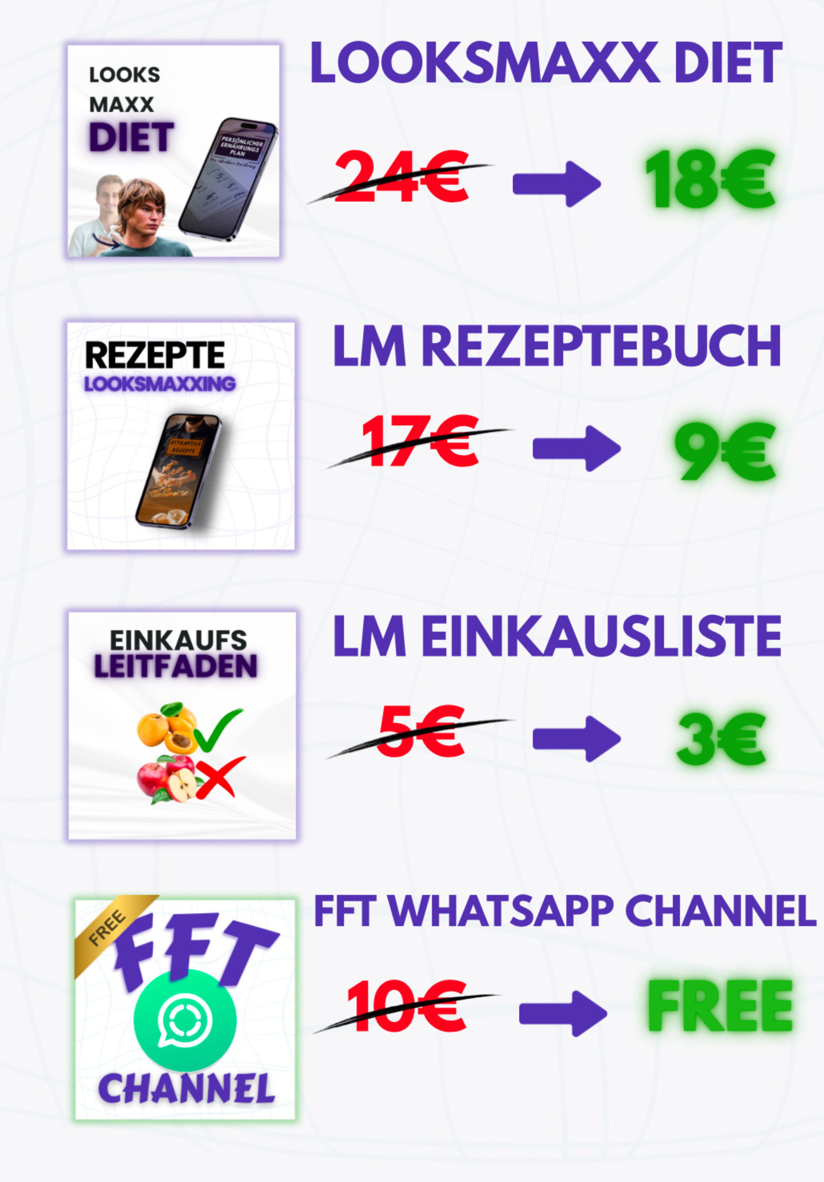 Die FFT-Looksmaxx-Ernährungsprodukte konnten schon über 2600 Leute erreichen. Über 220 Leute berichteten von unglaublichen Veränderungen. „Health is Looks“ – genau das ist unser Motto.