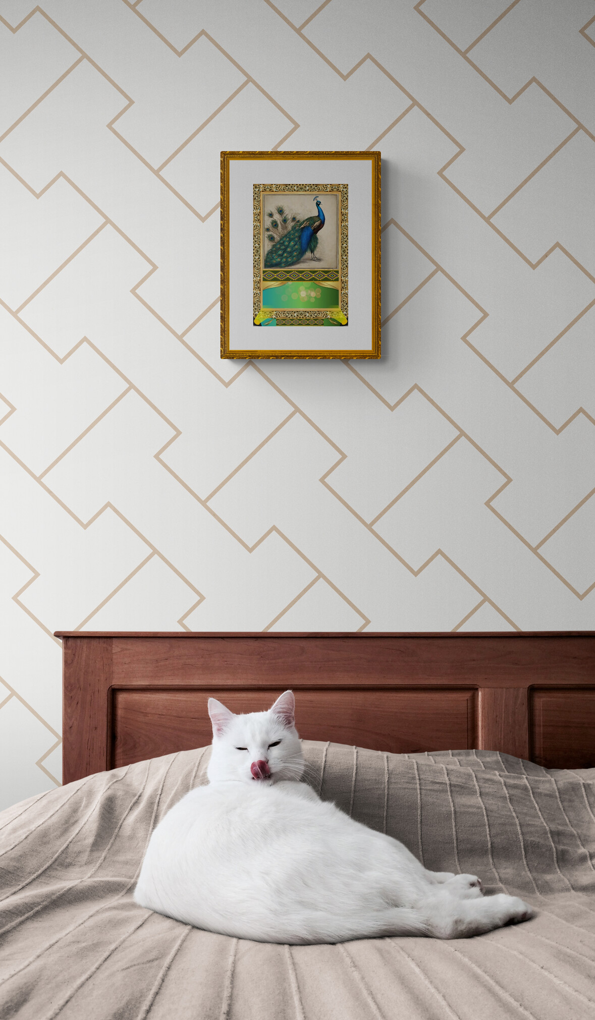 At the center, a resplendent depiction of a majestic peacock, its feathers adorned with intricate patterns inspired by Indian textiles. Each feather tells a story of rich heritage and timeless beauty, while the peacock itself symbolizes grace and abundance.