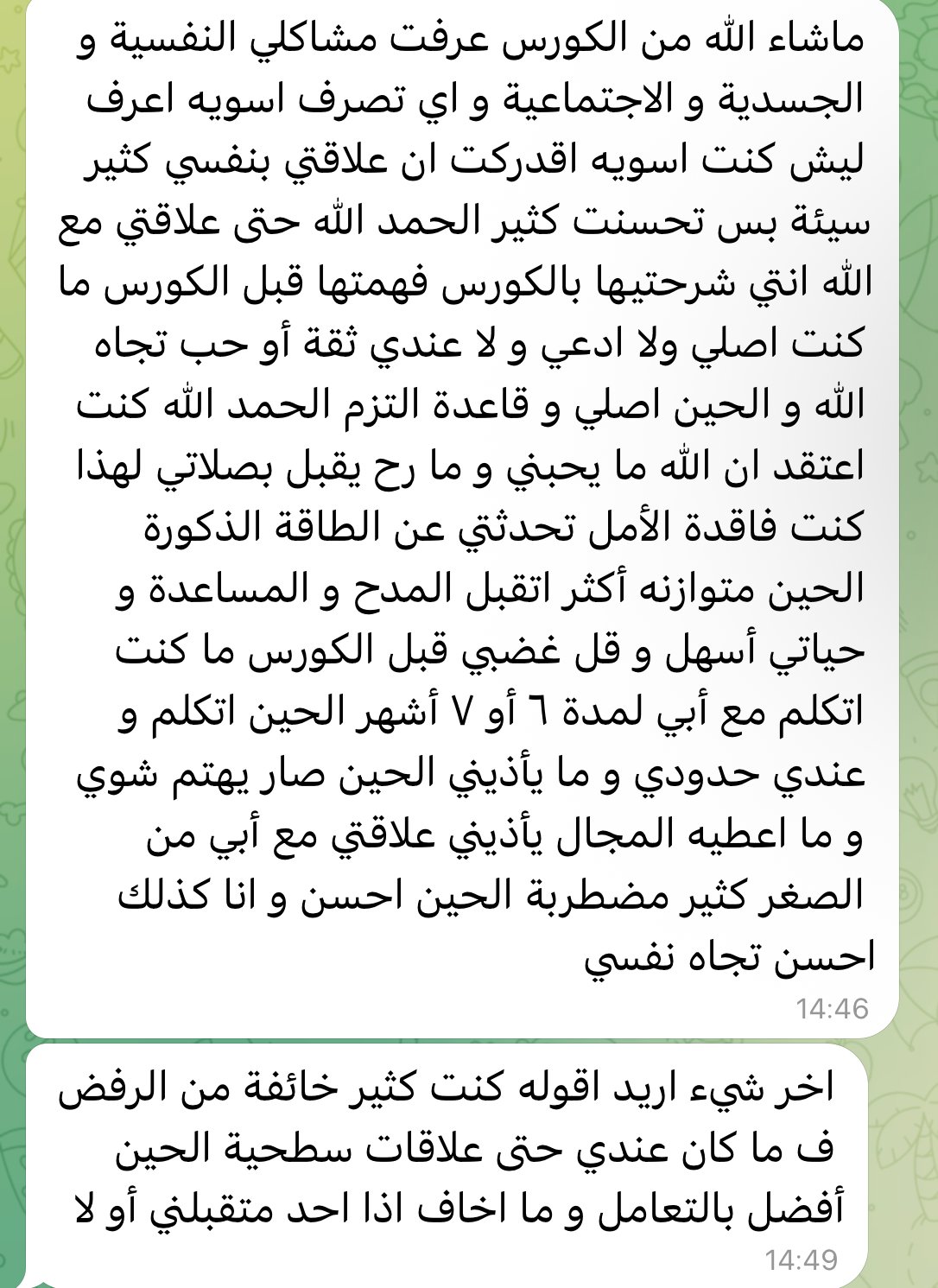 "والله لساتني أطبق كورس تشافي جرح الأب. عم شوف تغيرات. أشعر أنني أخف، وعرفت كثير أشياء عن نفسي ونقاط ضعفي واعترفت بها بعدما كنت متجاهلتها."