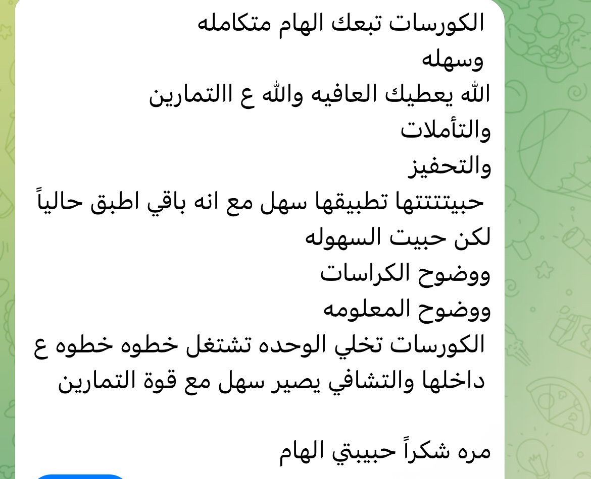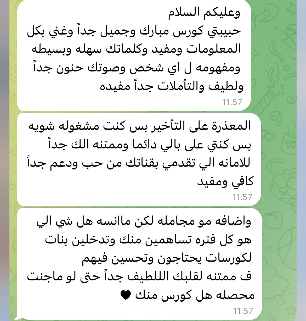 "حبيت أخبرك أنني أكملت قراءة الكورس ❤️ كورس جميل جدًا، أكثر شيء شيدني فيه هو طريقة كلامك الحنونة. كنت مستمتعة لدرجة أنني أكملته البارحة، ولم أكتفِ بالقراءة فقط، بل أخذت ملاحظات كثيرة. رغم أنني لم أمارس التمارين بعد، ولكنني بدأت."