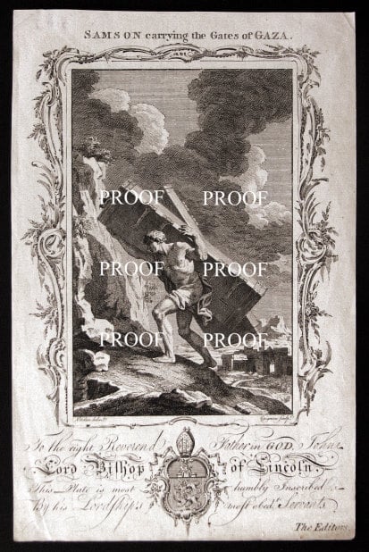 Samson Carrying the Gates of Gaza - Bible Engraving from the late 1700s - late 1800s. 300 DPI JPG.