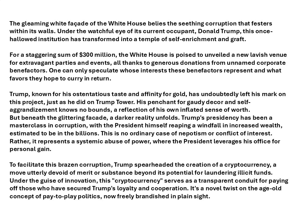 To facilitate this brazen corruption, Trump spearheaded the creation of a cryptocurrency, a move utterly devoid of merit or substance beyond its potential for laundering illicit funds. Under the guise of innovation, this "cryptocurrency" serves as a transparent conduit for paying off those who have secured Trump's loyalty and cooperation. It's a novel twist on the age-old concept of pay-to-play politics, now freely brandished in plain sight.