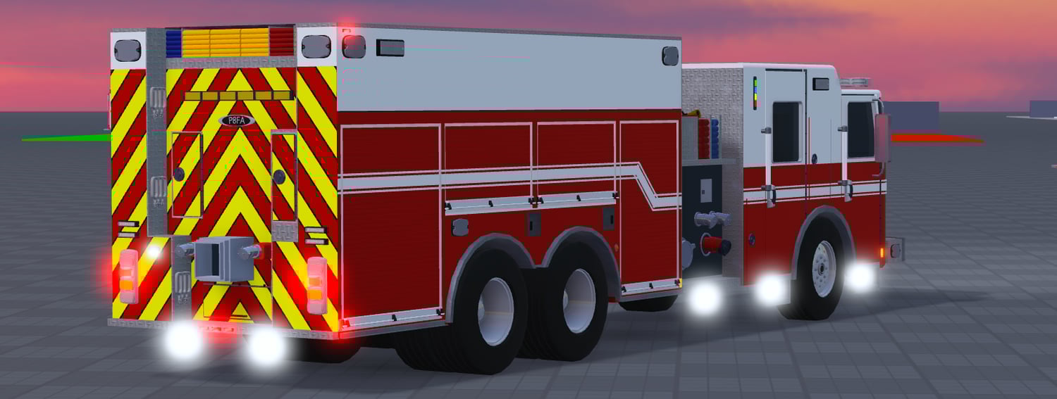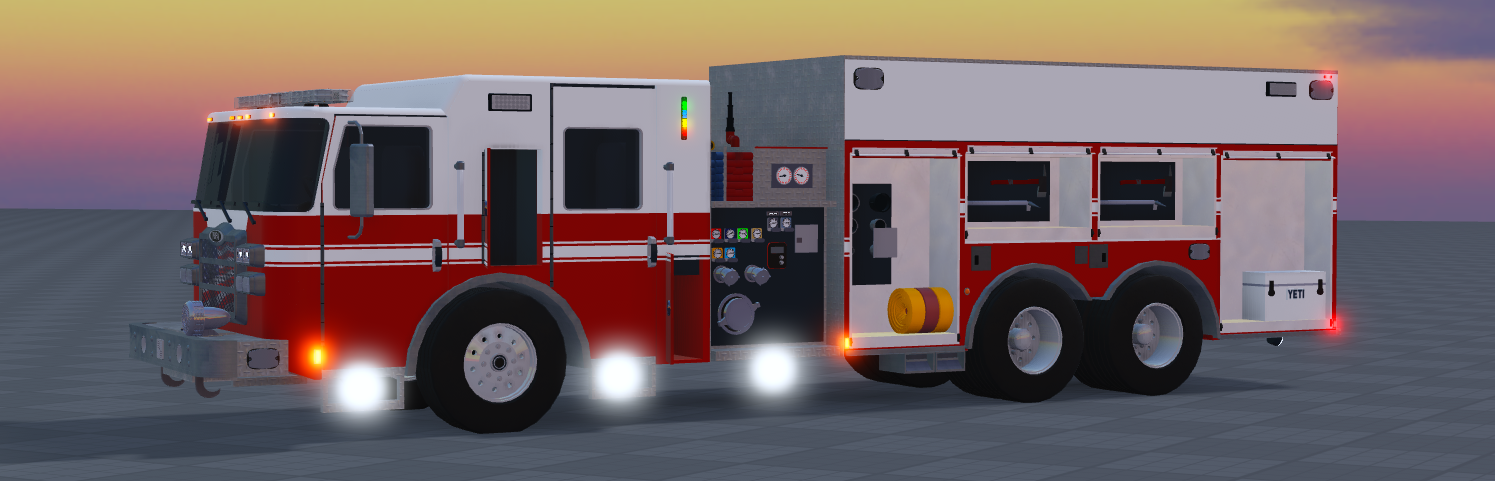 This is a Frontline 2020 Pierce Enforcer Rescue Tanker. The model is completely handmade in Roblox studio, and all the features work on the vehicle including the doors, compartments, ELS, and chassis. The truck is on Firestone chassis and does not have a UVMAP. Recoloring or striping will have to be done by hand.