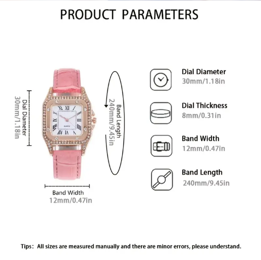 2pcs/set 1pc Roman Numeral Rhinestone Square Quartz Watch + 1pc Rhinestone Star Chain Bracelet