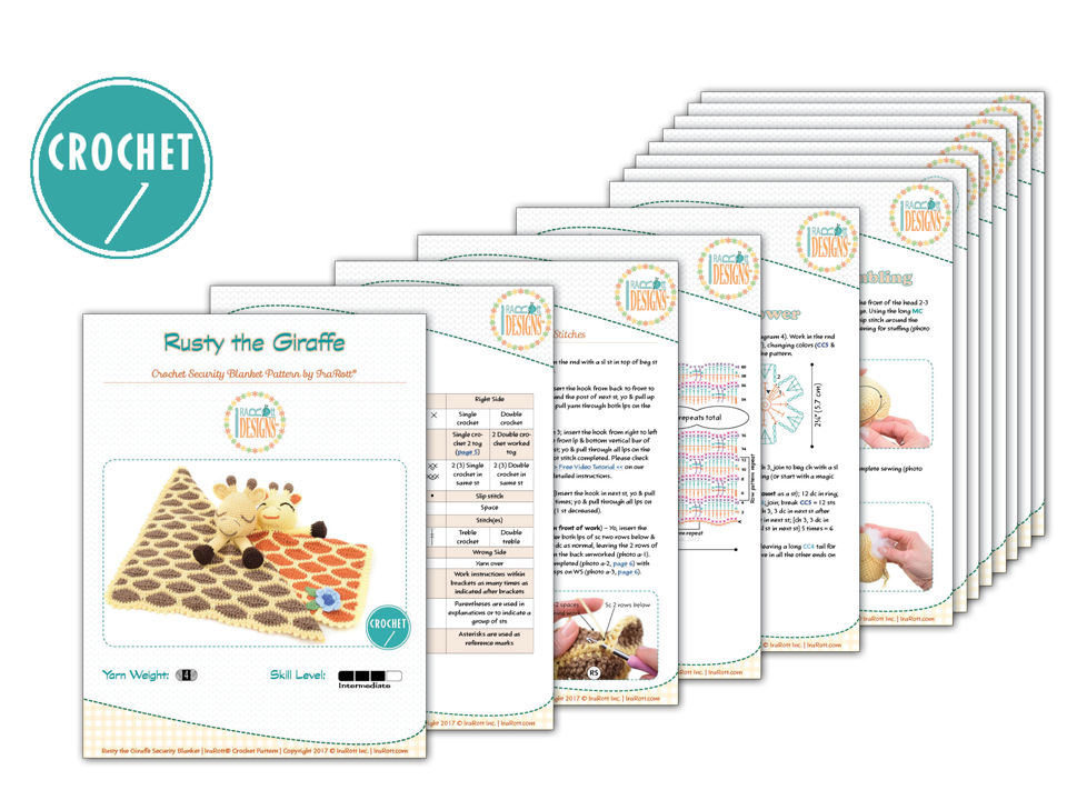 Rusty the Giraffe Lovey is sure to bring loads of laughs and cuddles! This pattern is written row-by-row using US crochet terms, along with crochet diagrams, step-by-step photos, and a conversion chart to UK terms.