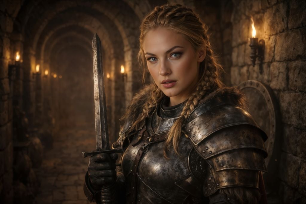 Steel gleams in the firelight. Stone arches fade into shadow. And at the heart of it all stands a warrior with calm, unbreakable resolve—ready to defend the realm when no one else will.