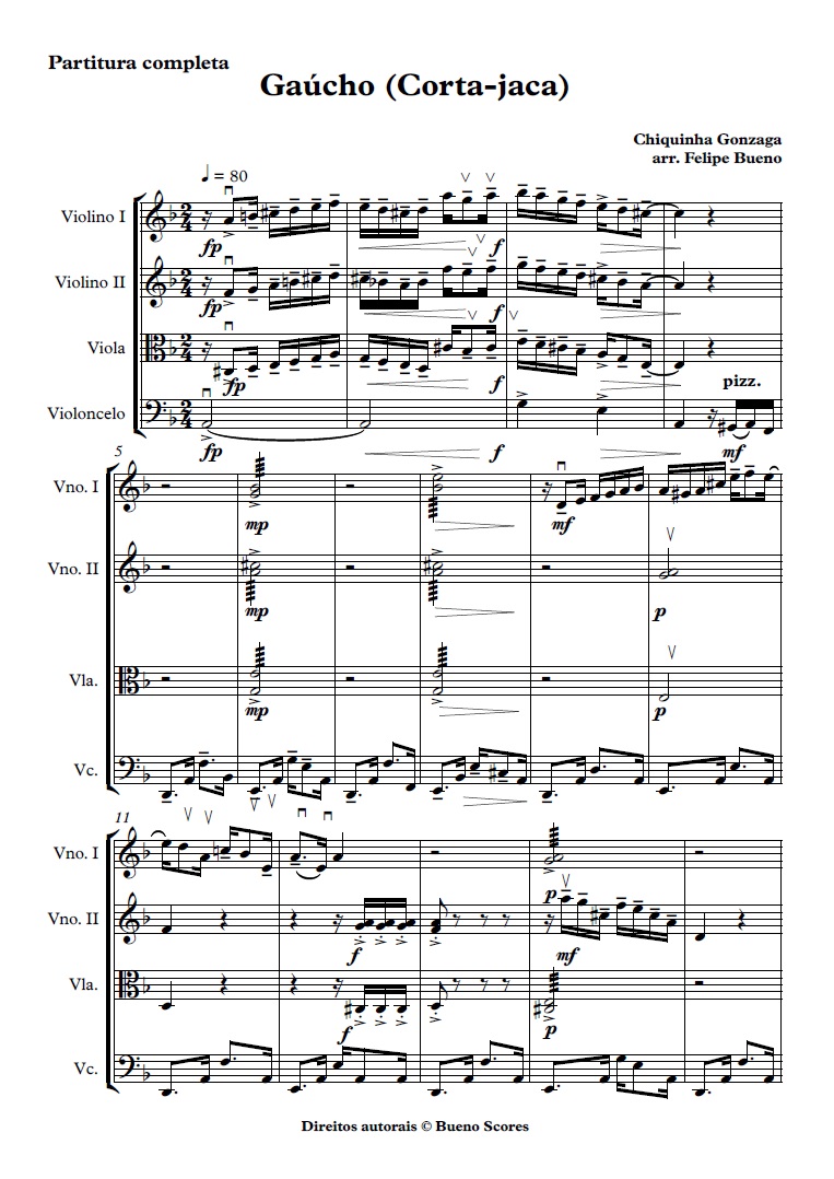 Compondo este arranjo, assim como outros que criei para o quarteto, meu objetivo foi destacar o formato do Quarteto de Choro. Em cada seção, um instrumento assume o papel de outro no conjunto tradicional de Choro; para a linha de baixo, essa função é desempenhada pelo violoncelo. Os violinos e a viola alternam frases rítmicas, ecoando os grooves de violão e pandeiro. Isso mantém o swing sempre presente e vibrante ao longo da peça.