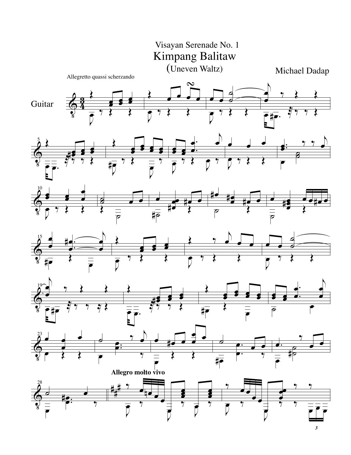 Original composition for classical guitar by Michael Dadap. Kimpang Balitaw which loosely translates to "Uneven Waltz" is the first piece of the Visayan Serenade Suite of the composer.