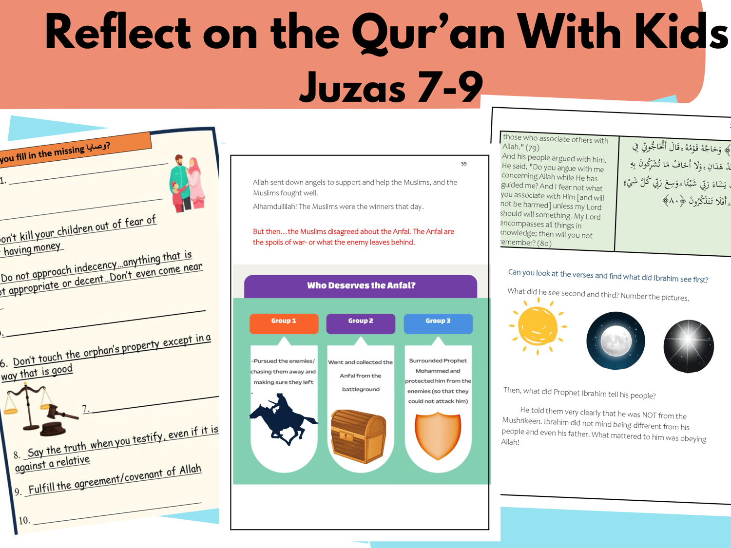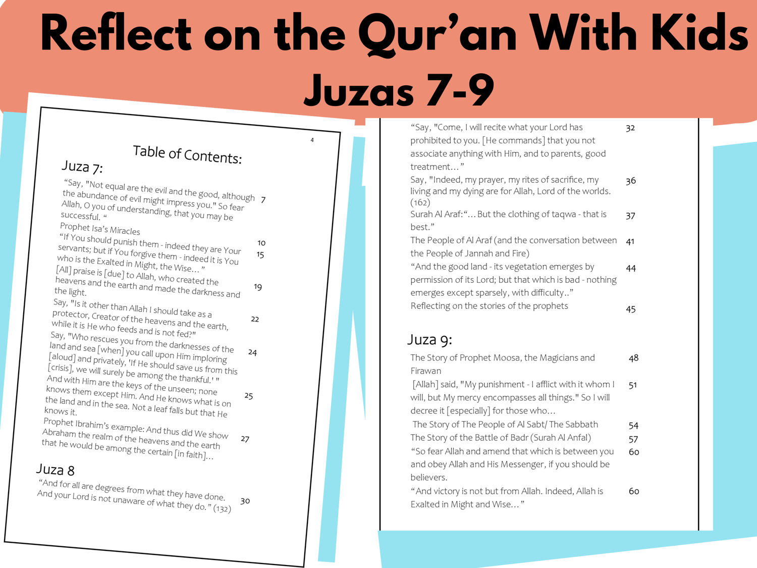 This specific book covers Juzas 7-9. Some of the verses and stories we explore in this book: