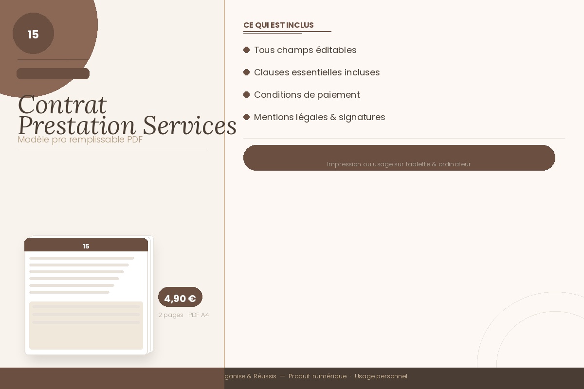 Protégez votre activité et cadrez vos missions avec ce modèle de contrat de prestation de services prêt à l'emploi. Remplissable directement en PDF, il couvre les mentions essentielles : description de la mission, conditions tarifaires, délais, propriété intellectuelle et résiliation. Design sobre et professionnel.