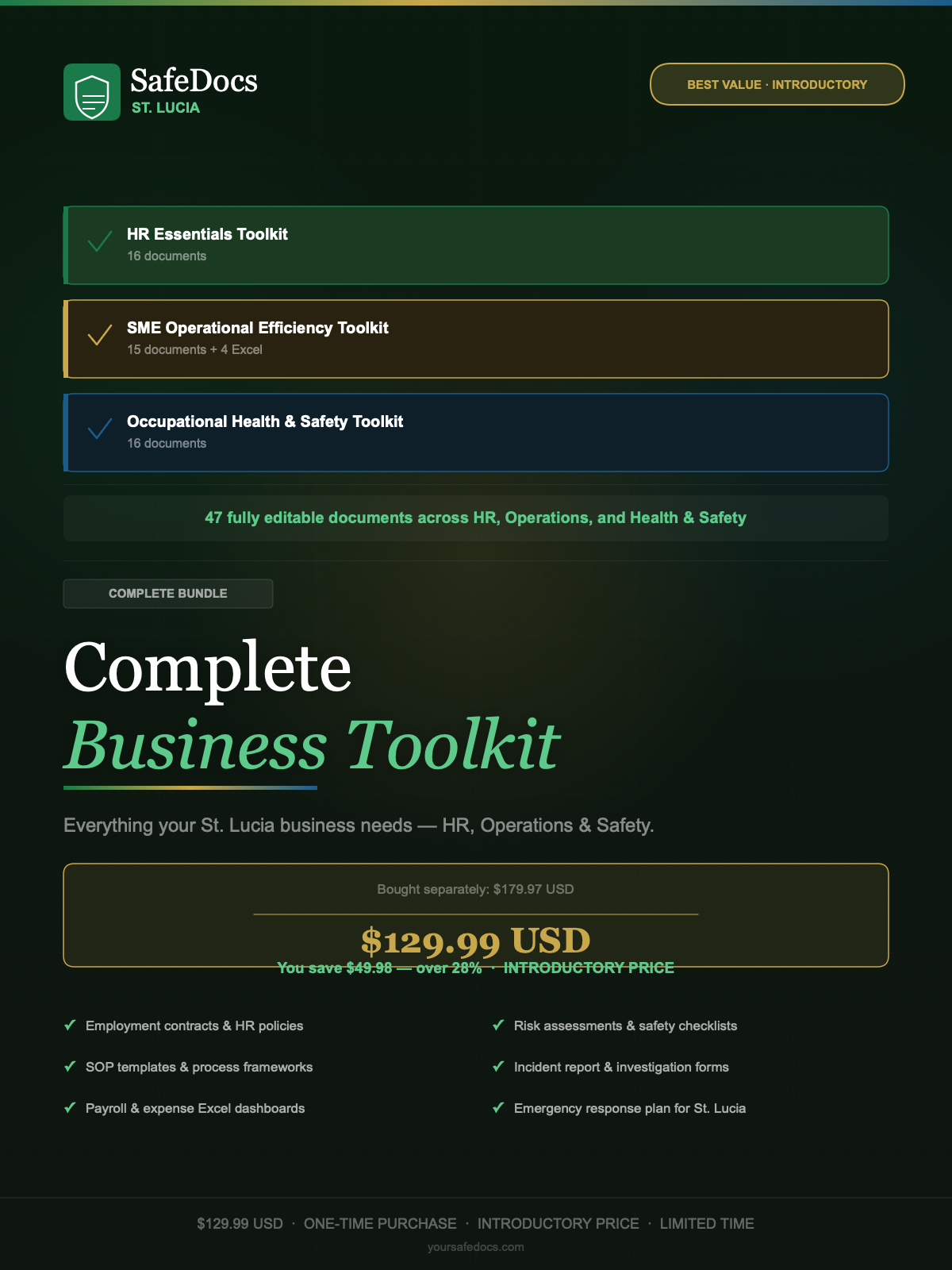 โ 47 fully editable documents โ Microsoft Word, Google Docs, and Excel โ Built for St. Lucia businesses โ Labour Code, NIC Act, and OHS Act compliant โ Emergency response plan includes verified St. Lucia contacts โ 911, Hospital, NEMO, LUCELEC, WASCO โ 6 months of free updates included for all three toolkits โ Email support:ย businessautopilot@yoursafedocs.comย โ Licensed to one business โ not for redistribution