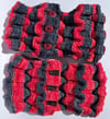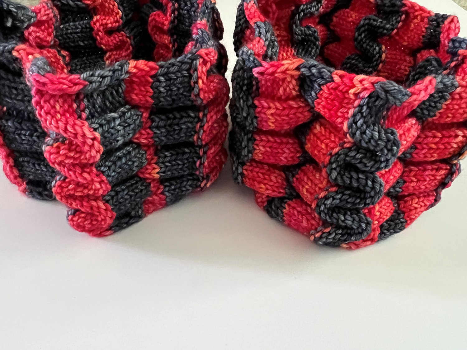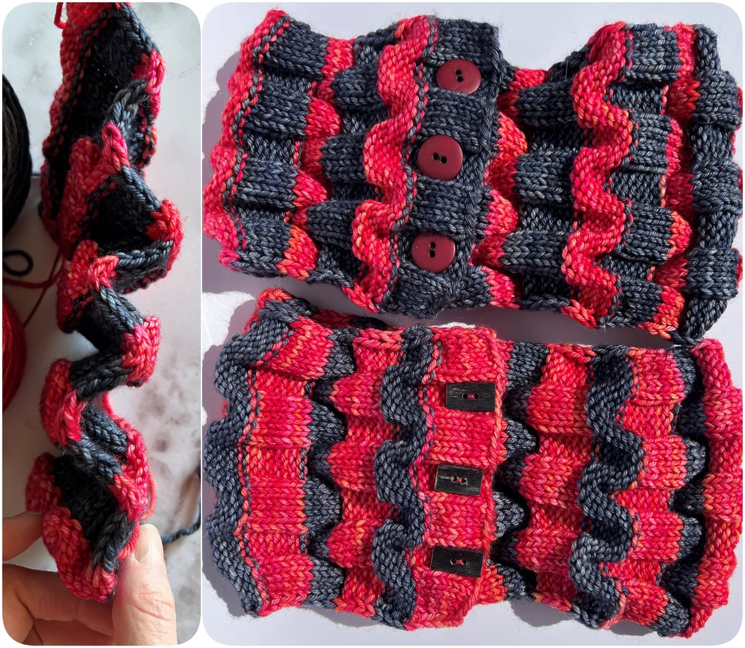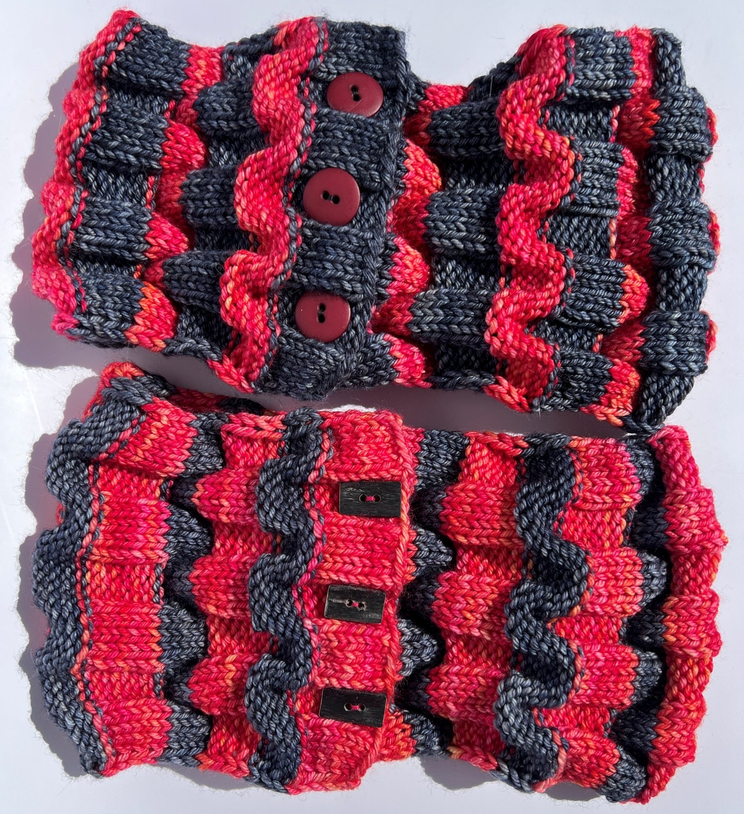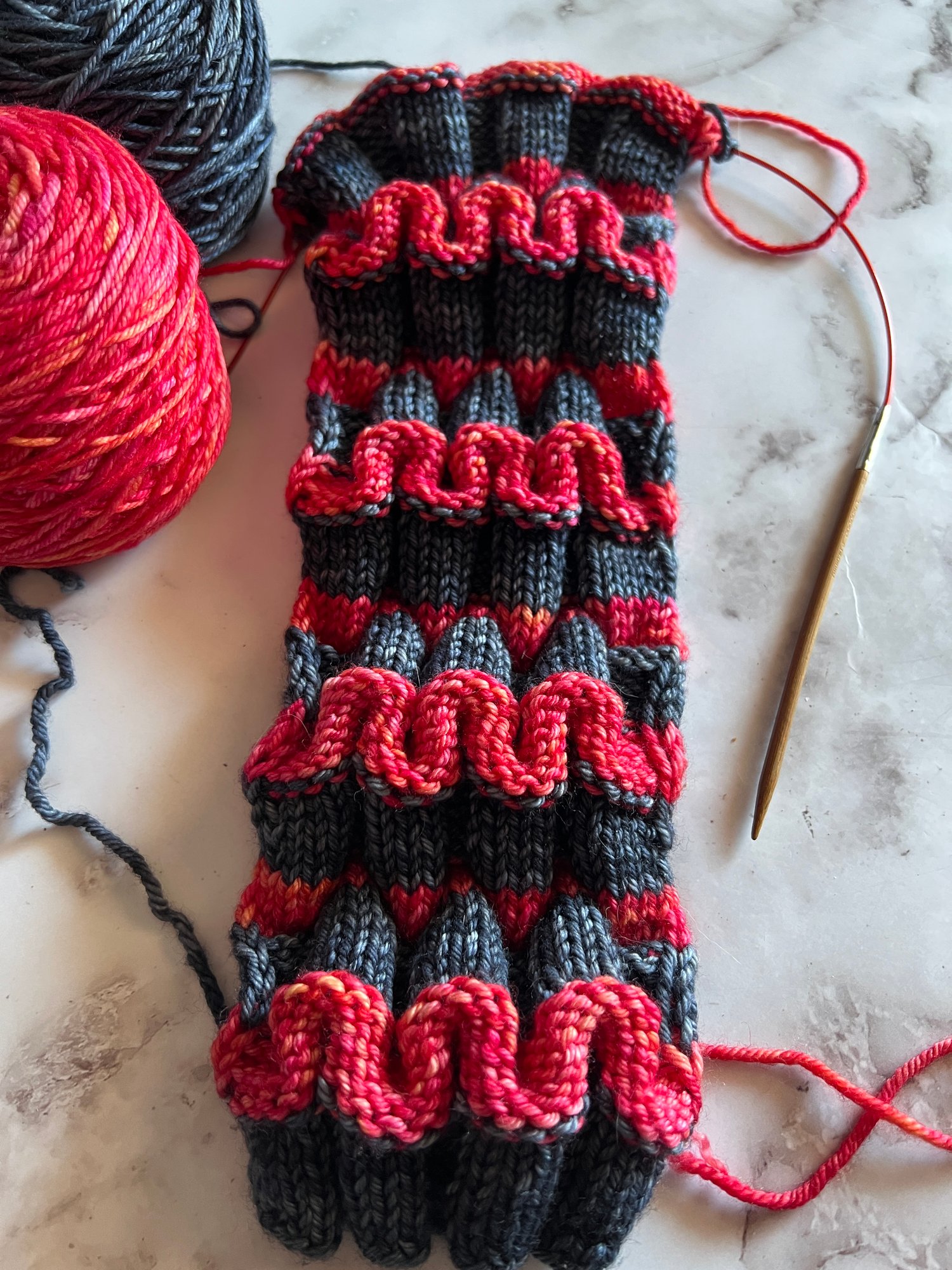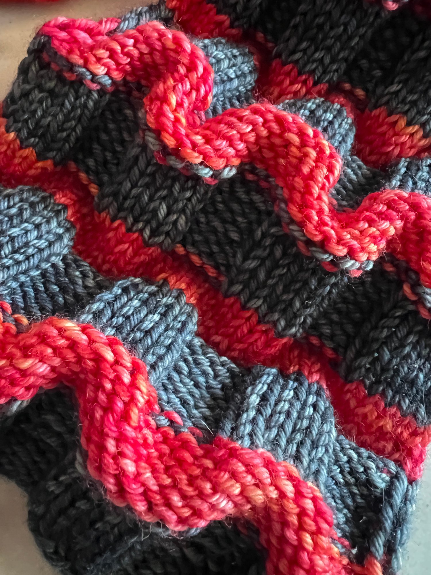 Alternating sections of 5 by 5 ribbing, with contrast color ridges of Stockinette and Reverse Stockinette, come together to create seesawing levels of reversible accordion texture.