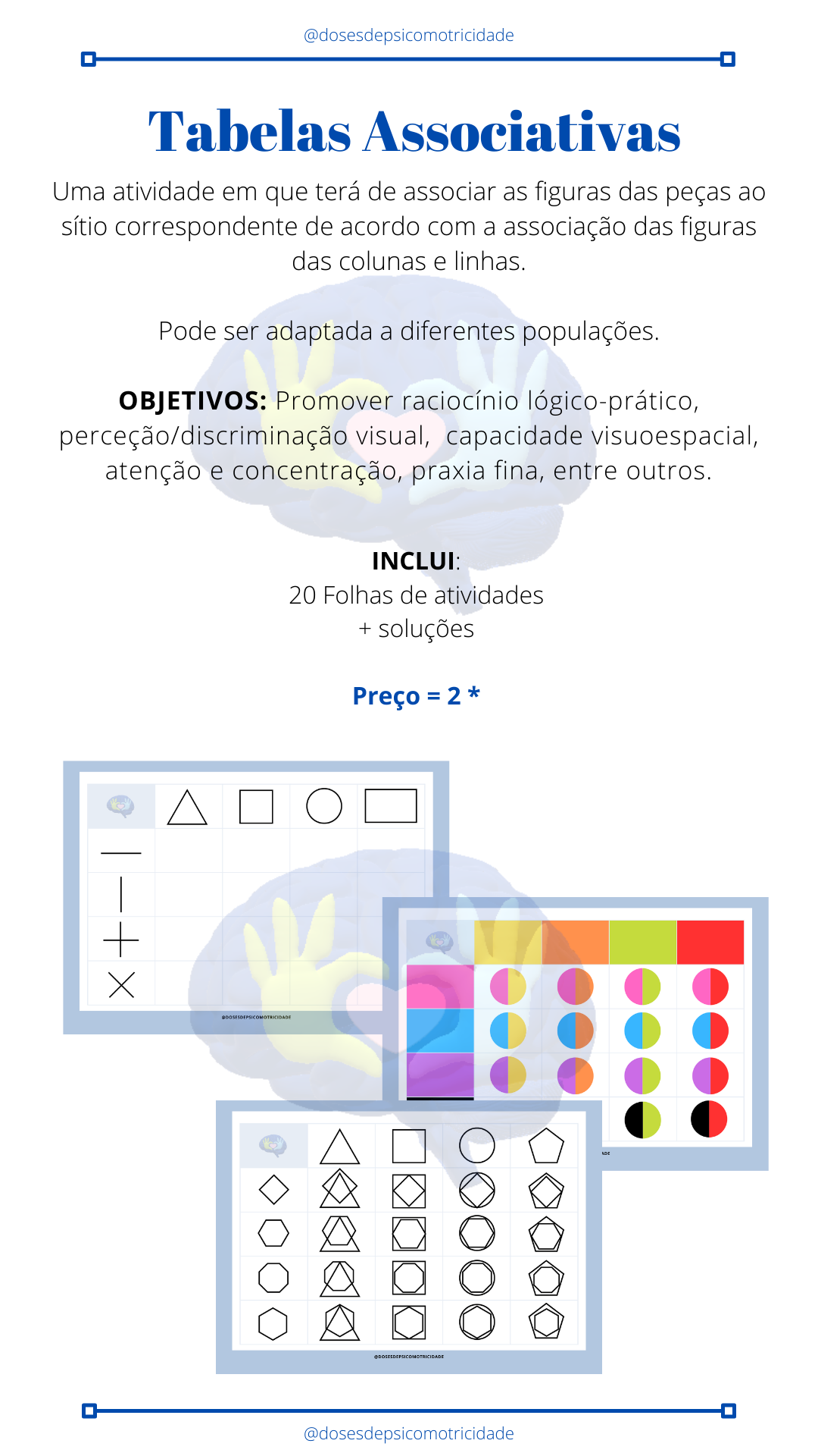 OBJETIVOS: Promover raciocínio lógico-prático, perceção/discriminação visual, capacidade visuoespacial, atenção e concentração, praxia fina, entre outros.
