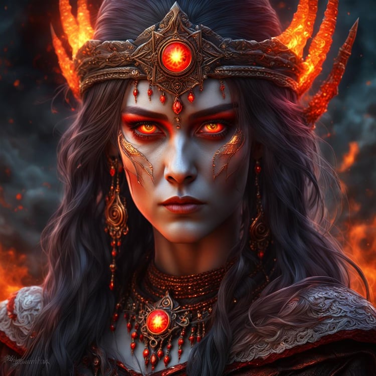 Product Description: Unleash the fiery power of the "Majestic Fire Sorceress Queen," a photorealistic digital portrait capturing the intense gaze and commanding presence of a sorceress queen in the Inferno Temple. With glowing red eyes and regal attire, she exudes majesty and raw power.