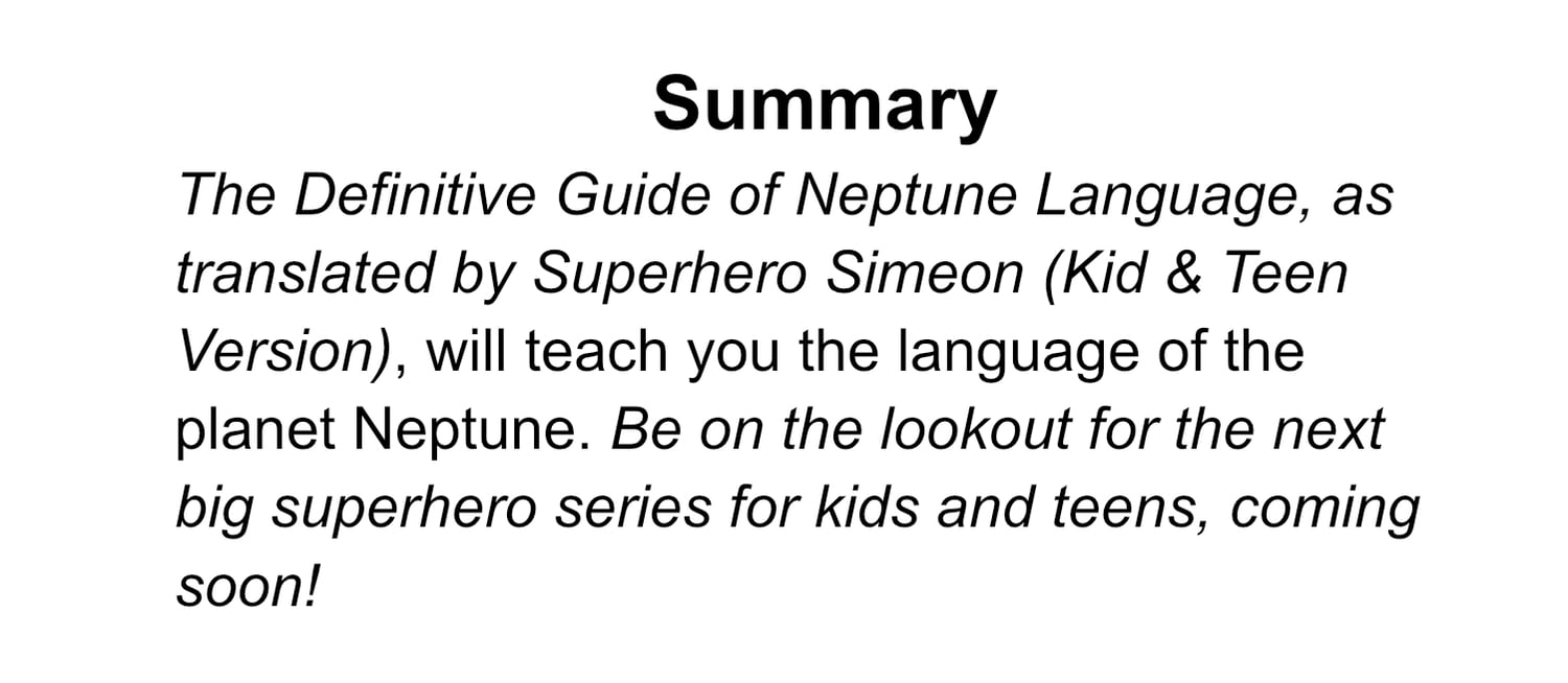 The Definitive Guide of Neptune Language, as translated by Superhero Simeon (Kid & Teen Version), will teach you the language of the planet Neptune. Be on the lookout for the next big superhero series for kids and teens, coming soon!