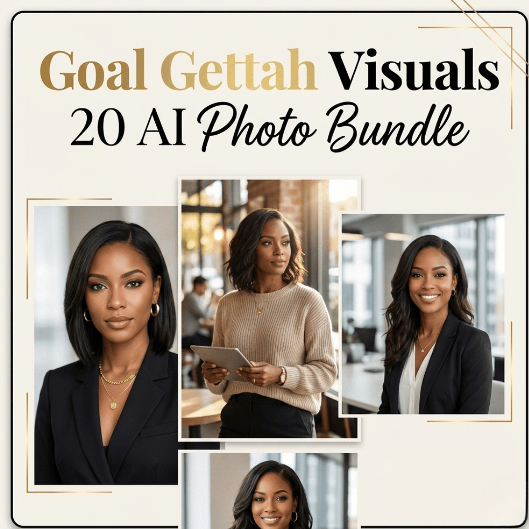 The Goal Gettah Visuals 20-Image Bundle gives you a versatile library of polished, professional visuals — perfect for entrepreneurs, creatives, and service providers who want high-quality content without repeated photoshoots.