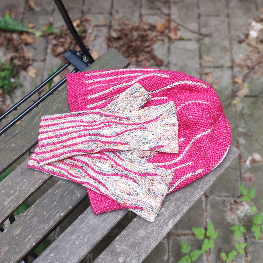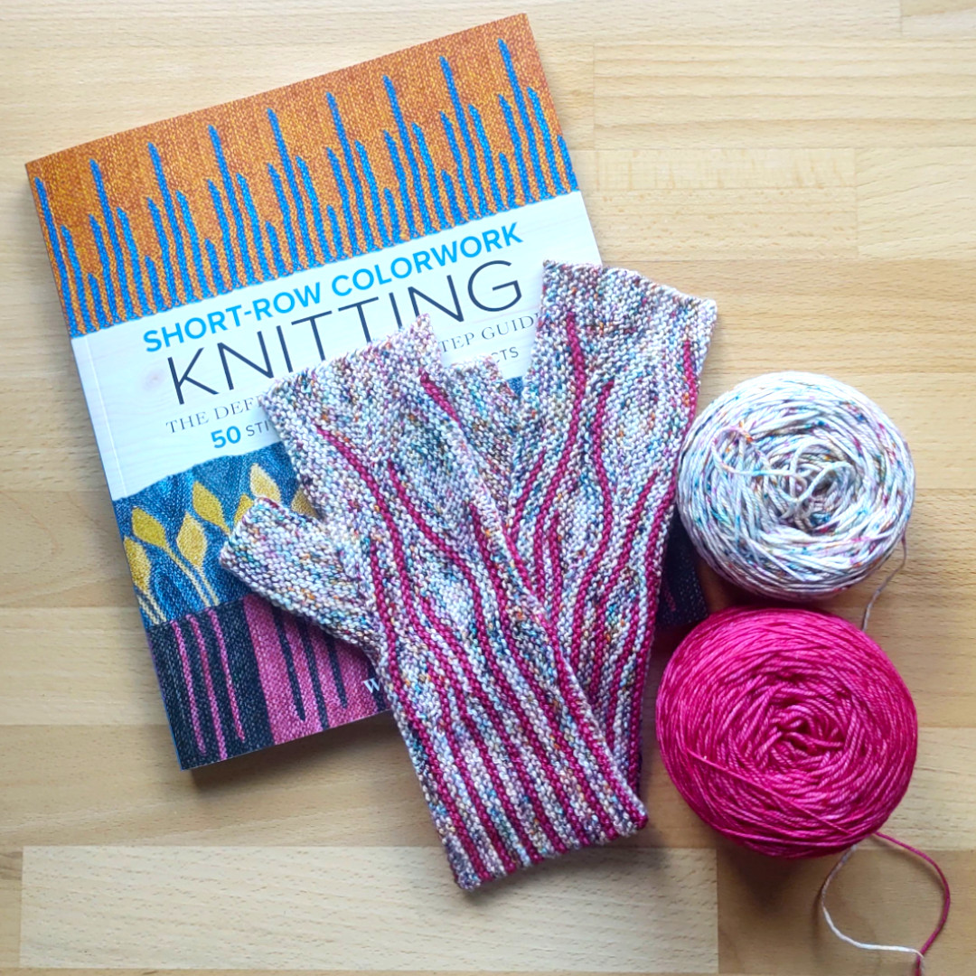 These mitts were inspired by the motif „Flames“ from the book ‘Short-Row Colorwork Knitting‘ by Woolly Wormhead. The mitts are worked sideways in garter stitch and then grafted. The construction is based on the mitts design from the named book. Both gloves are worked the same and there is no distinction made between left and right.