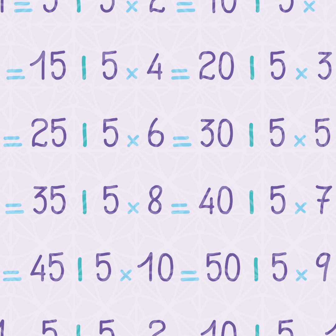 Five times table seamless illustration pattern. Hand written mathematical operation vector background.
