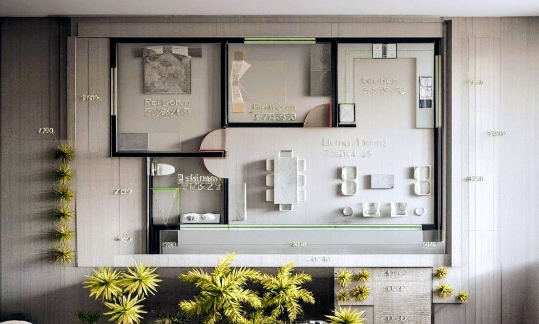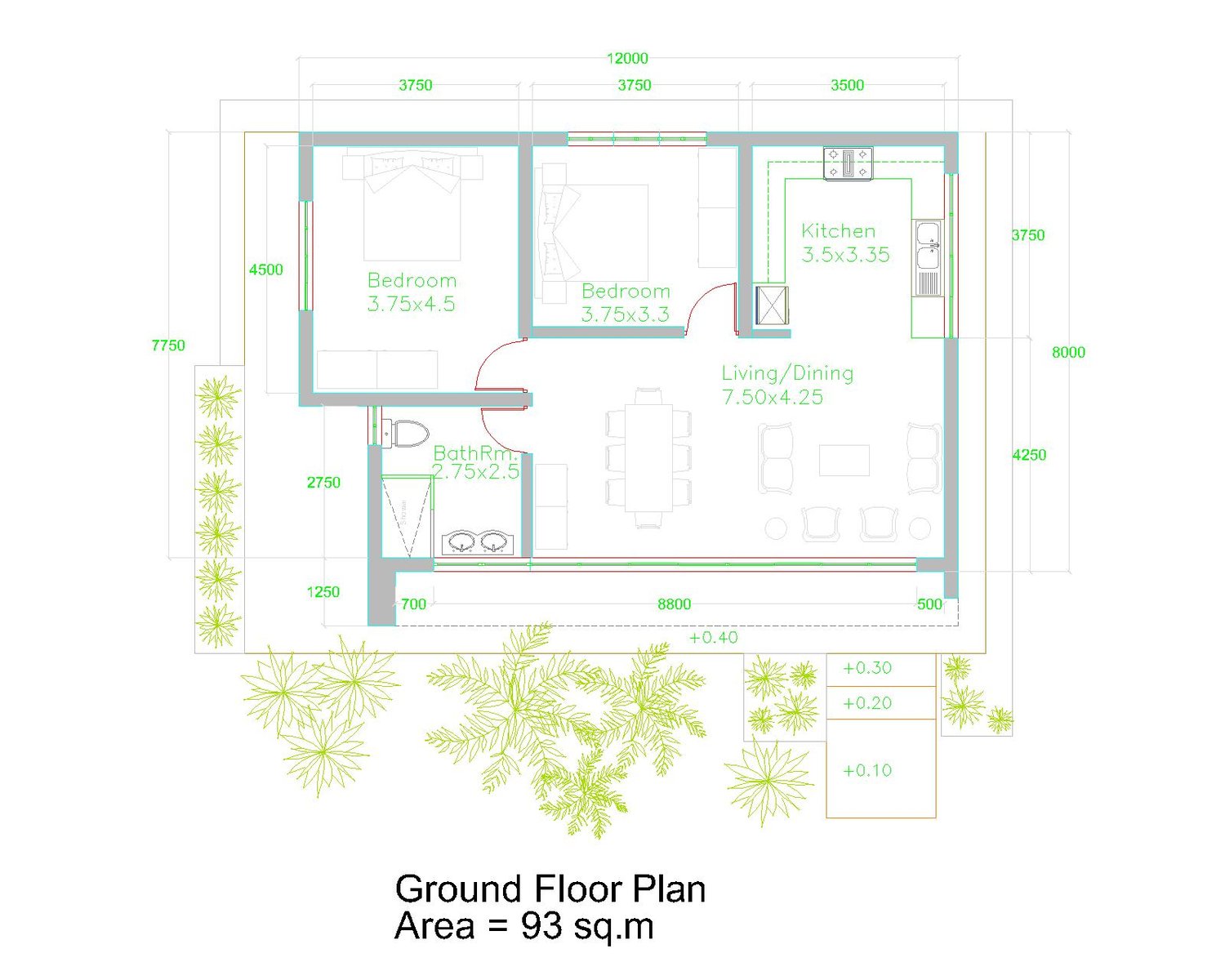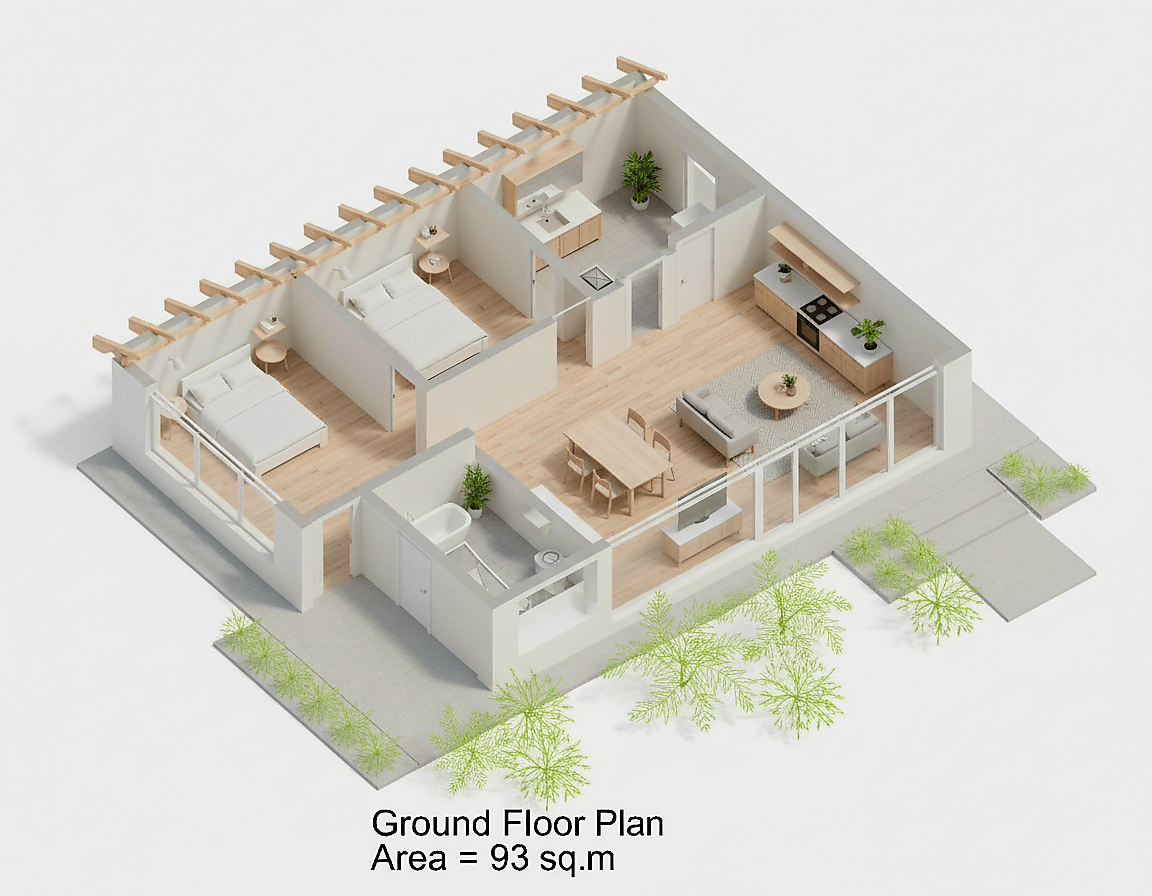 A serene one-storey biophilic home designed to blend modern living with nature. This 93 sq.m. layout features a spacious open-plan living and dining area, an open kitchen, and two comfortable bedrooms sharing a well-planned bathroom.