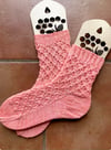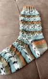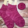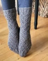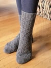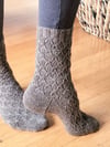 Fingering weight sock yarn knit pattern is filled with easy to execute left and right twists, intersecting to create small spaces that expand beautifully when worn. Twists and turns, nooks and crannies evoke a sensation of seeking, excitement, and cozy places. The cables we create in the knitting process often resemble these sensations.