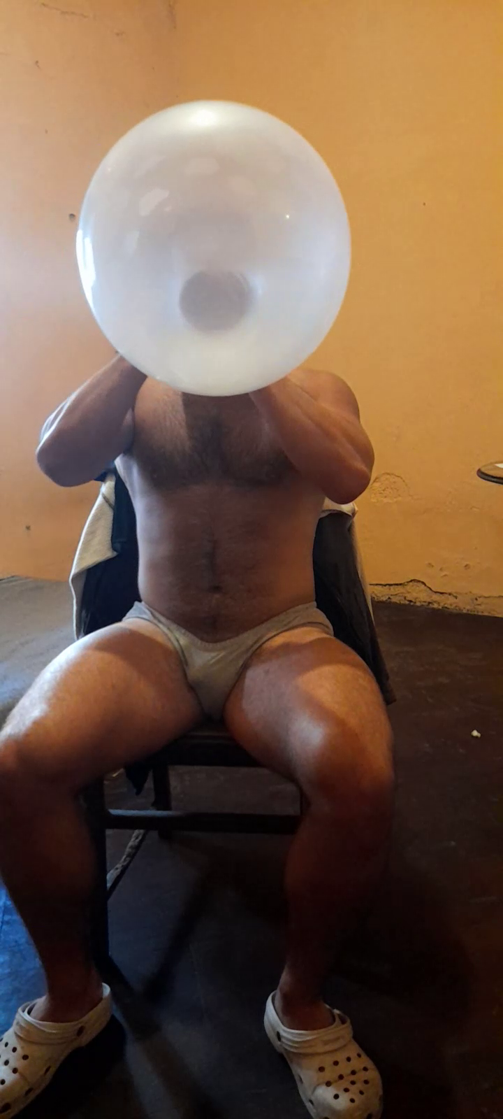 He sits on them, stomps them, blows to pop, squeezes and even humps one!