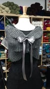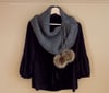 CONSTRUCTION: The body of the shawl is knit flat in garter st and uses Judy’s Magic Cast-On as a provisional CO. Provisional sts are picked up to finish the left front side of the shawl. Detailed instructions are provided for creating the pleats that give the shawl its “built-in” drape. Buttons can be sewn on for an invisible look with options for a removable bow or pom-poms. Button holes are not needed due to the nature of the fabric.