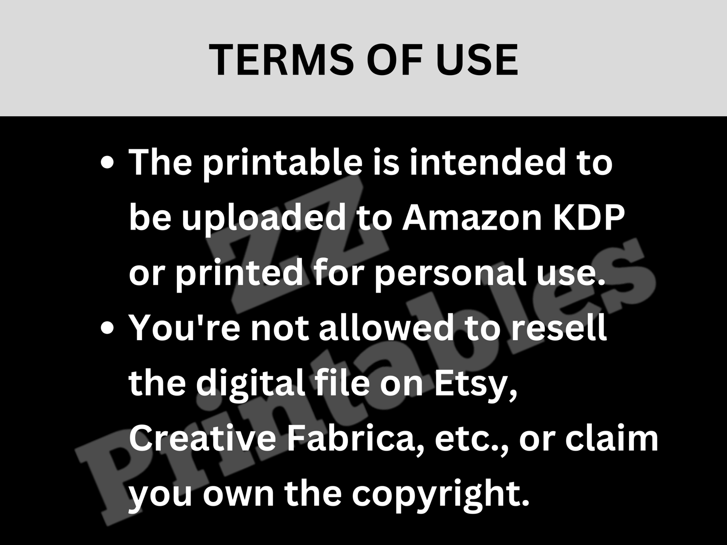 The printable is intended to be uploaded to Amazon KDP or printed for personal use. You're not allowed to resell the digital file on Etsy, Creative Fabrica, etc., or claim you own the copyright.