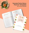 Sample Party Menu Planner Template (6 pages): track invites and RSVPs, set event details, plan ingredients and courses, manage venue/decor/food budgets, and print service boards for hot, cold, dessert, and drinks. Instant-download PDF.