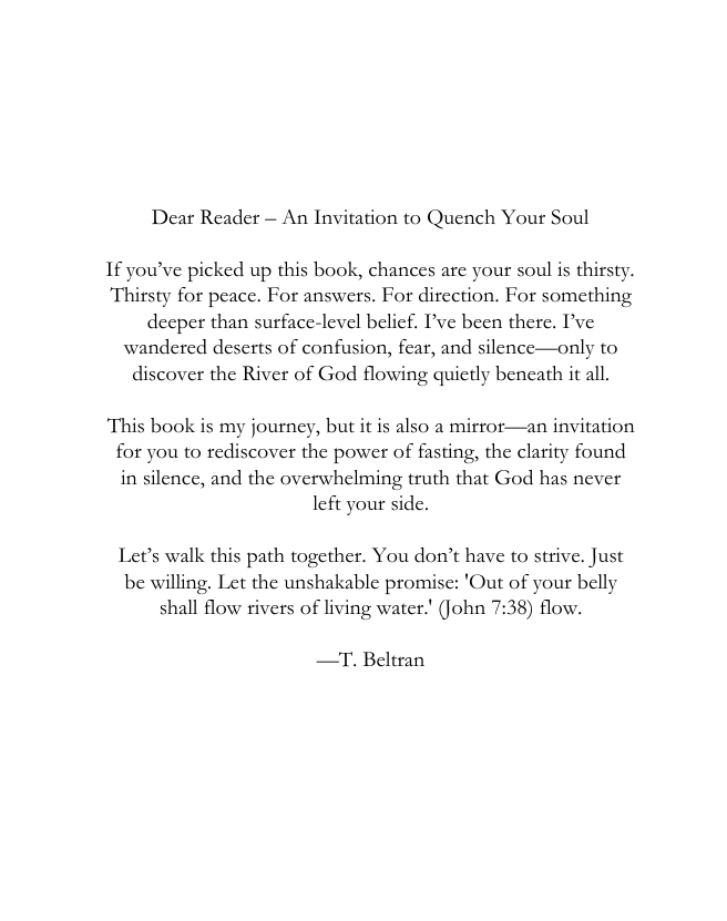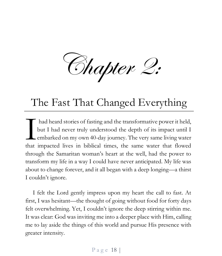 In these deeply personal pages, the author invites you into a transformational journey—one marked by spiritual hunger, radical obedience, and a thirst that only God could satisfy. Through the discipline of fasting and prayer, she discovered not only a deeper connection with God but also His voice, His plan, and His provision.