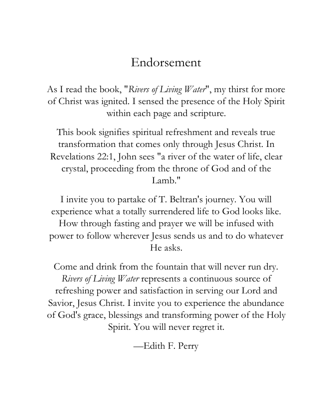 Rivers of Living Water: A Fasted Life is a powerful memoir that reveals how fasting became the key to unlocking divine intimacy, purpose, and supernatural doors of opportunity across the globe.