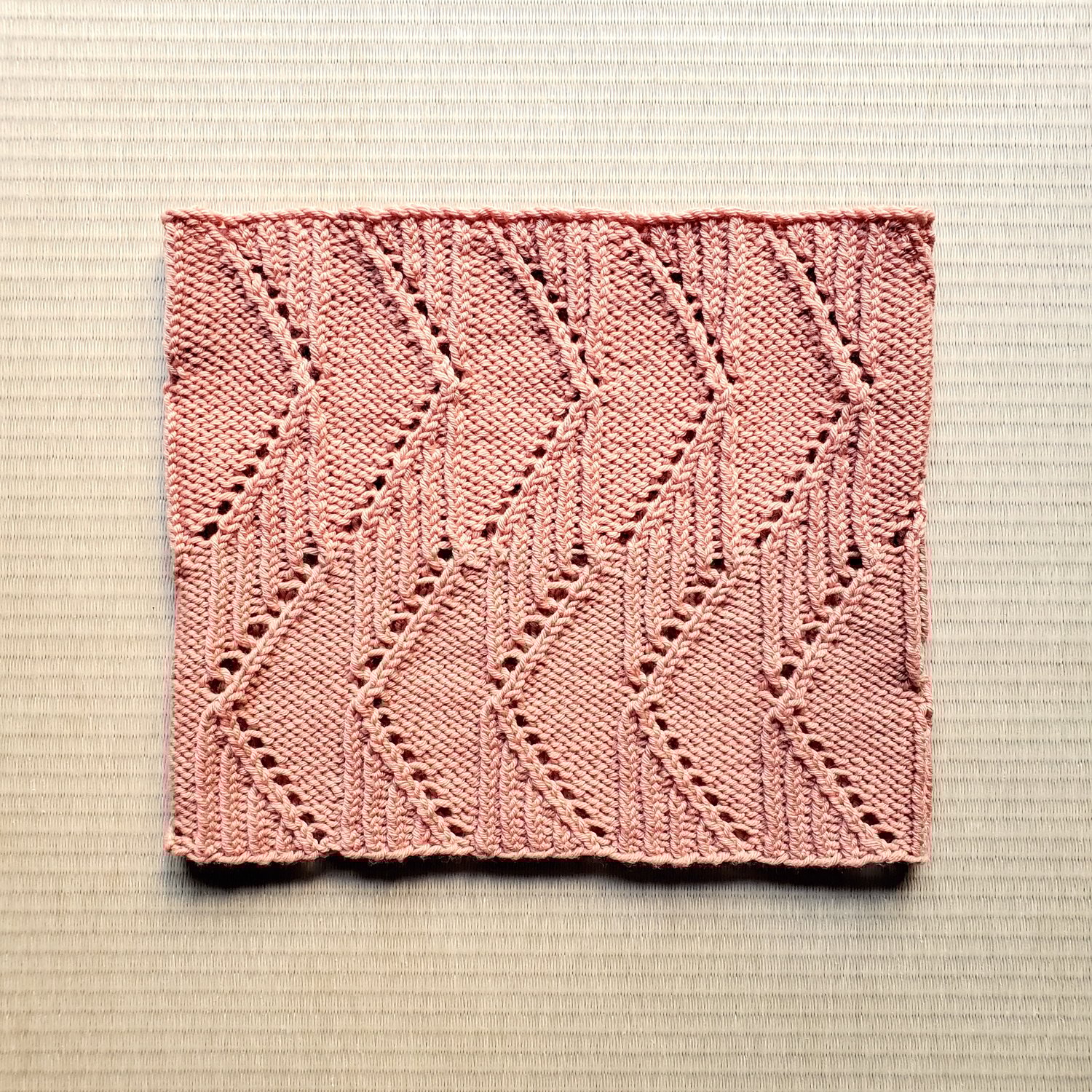 The Diamond cowl is worked in the round from the bottom up, starting with a twisted rib hem. The twisted ribbing flows into parallel lines of twisted stitches that frame diamonds of stockinette, and the cowl is finished with a twisted rib hem at the top.