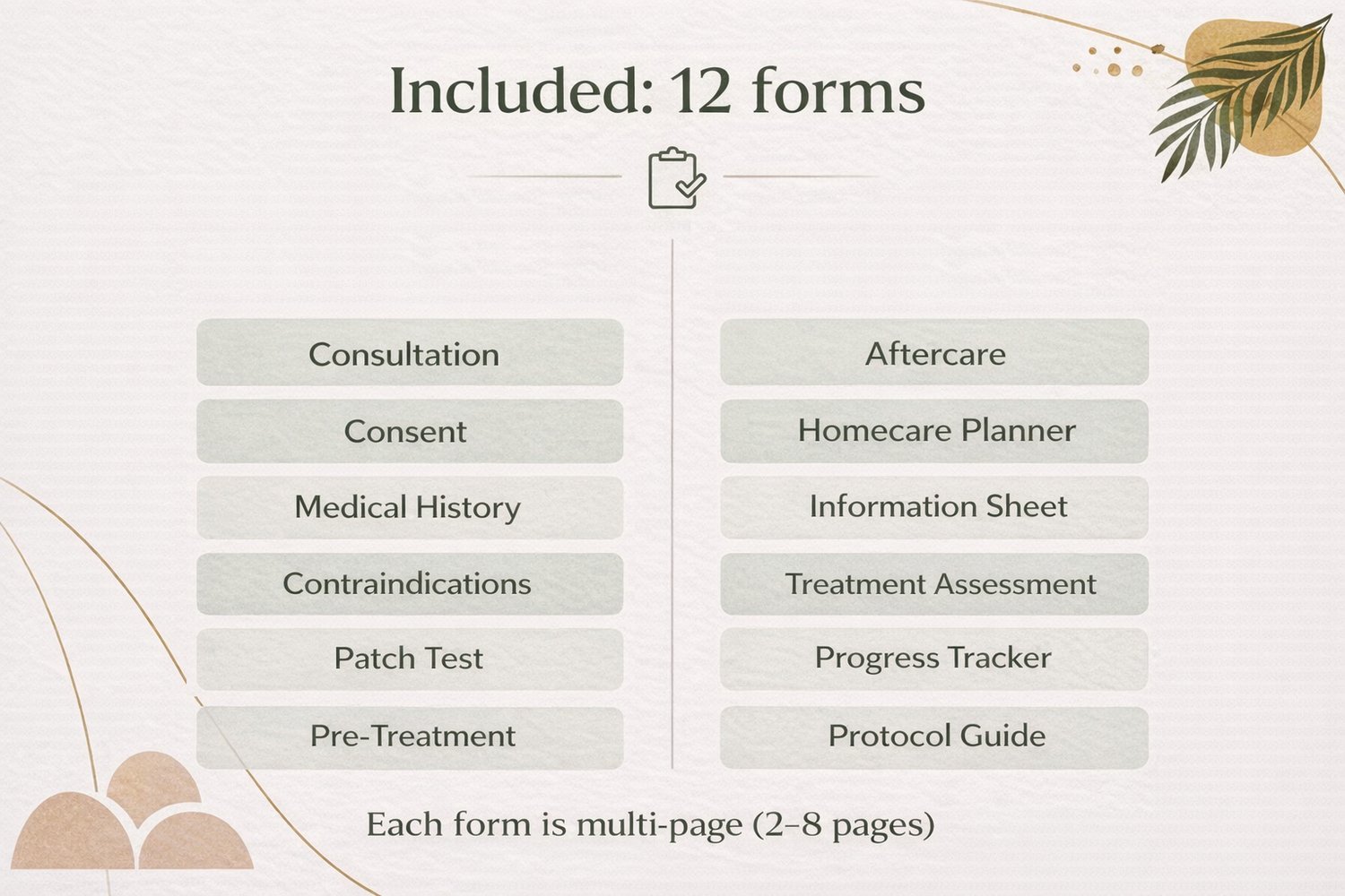 A clinic-grade Chemical Peel Forms Bundle (12 fillable PDFs) for beauty & aesthetics practitioners. Designed to keep your paperwork consistent, professional, and ready-to-use across consultations, consent, treatment sessions, and aftercare.