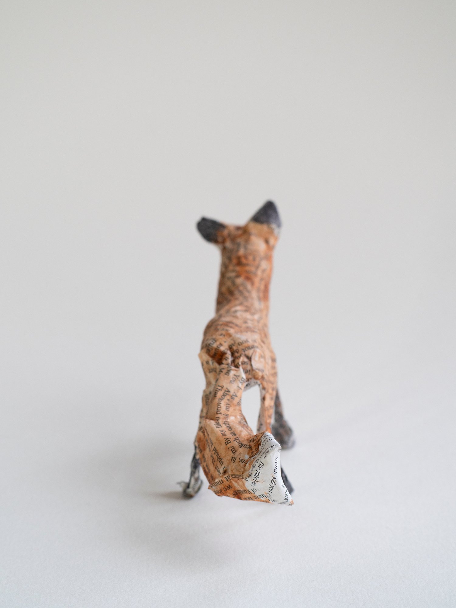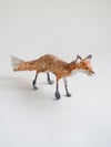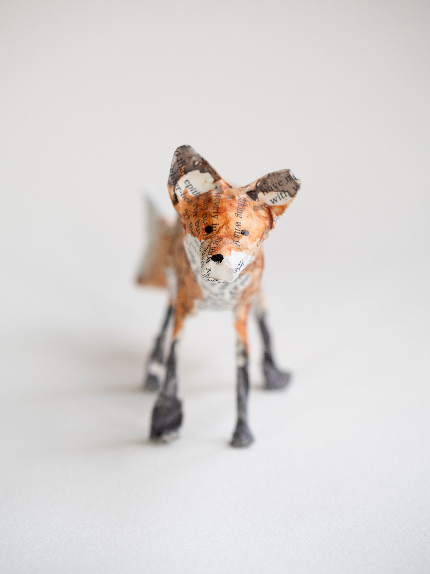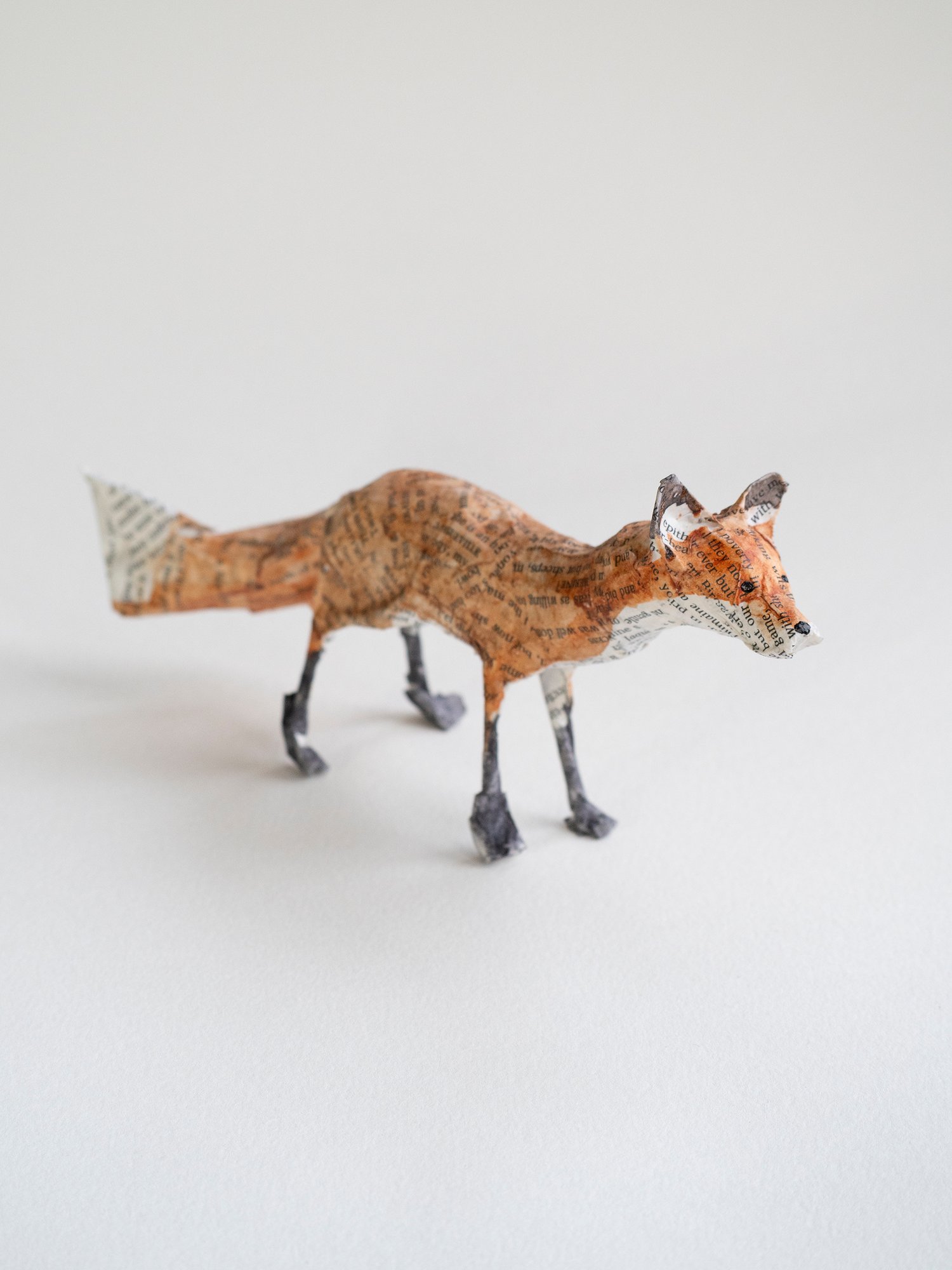 A handmade paper mache folk art sculpture of a standing fox. It is created from paper mache using book paper, wire and watercolour and is approx 8cm high x 19cm long. Made with newspaper, wire, glue, pages from Shakespeare, and watercolour paint.
