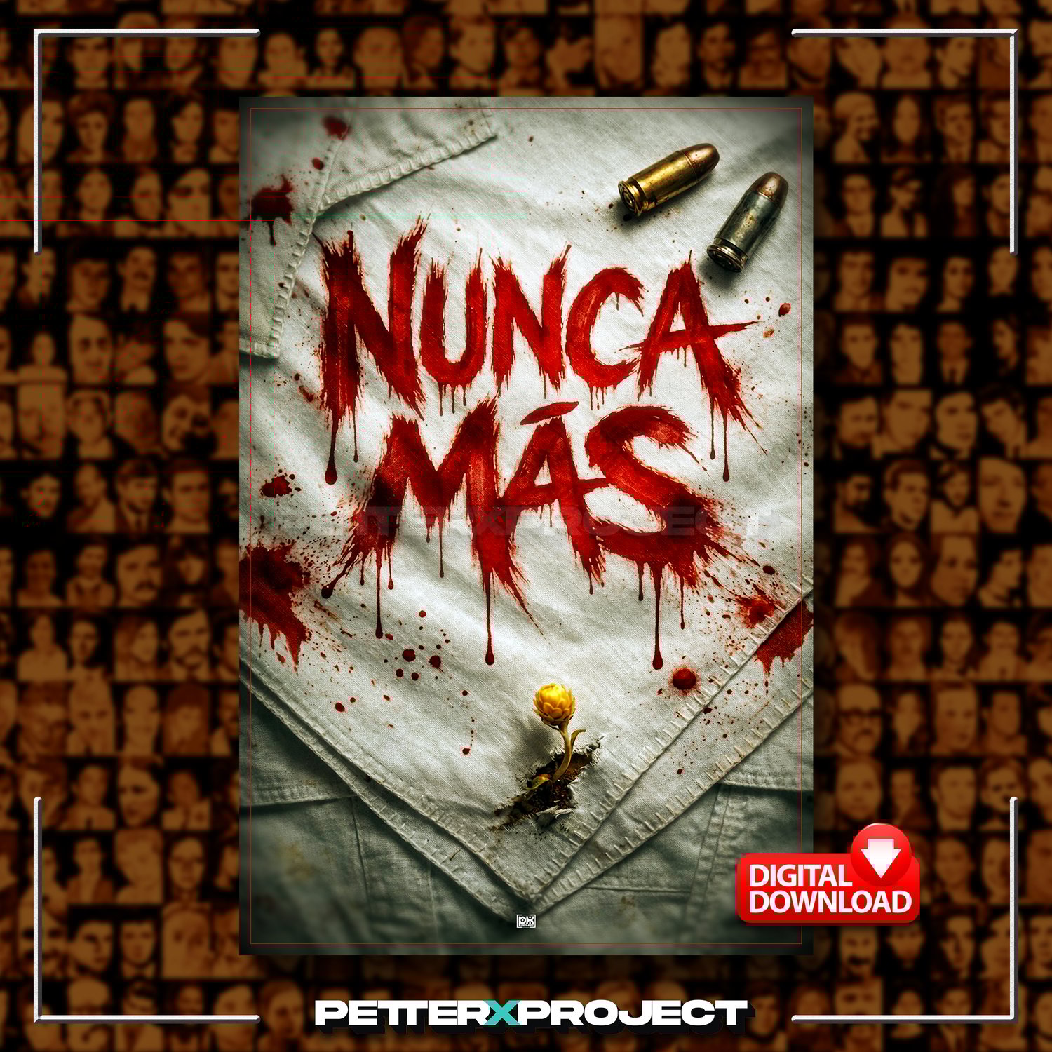 ✦ A striking printable poster inspired by historical memory, featuring the phrase “NUNCA MÁS – 50 Years of Memory.” This piece blends raw emotion, symbolic storytelling, and a dark grunge aesthetic into a powerful composition that honors truth, justice, and remembrance.