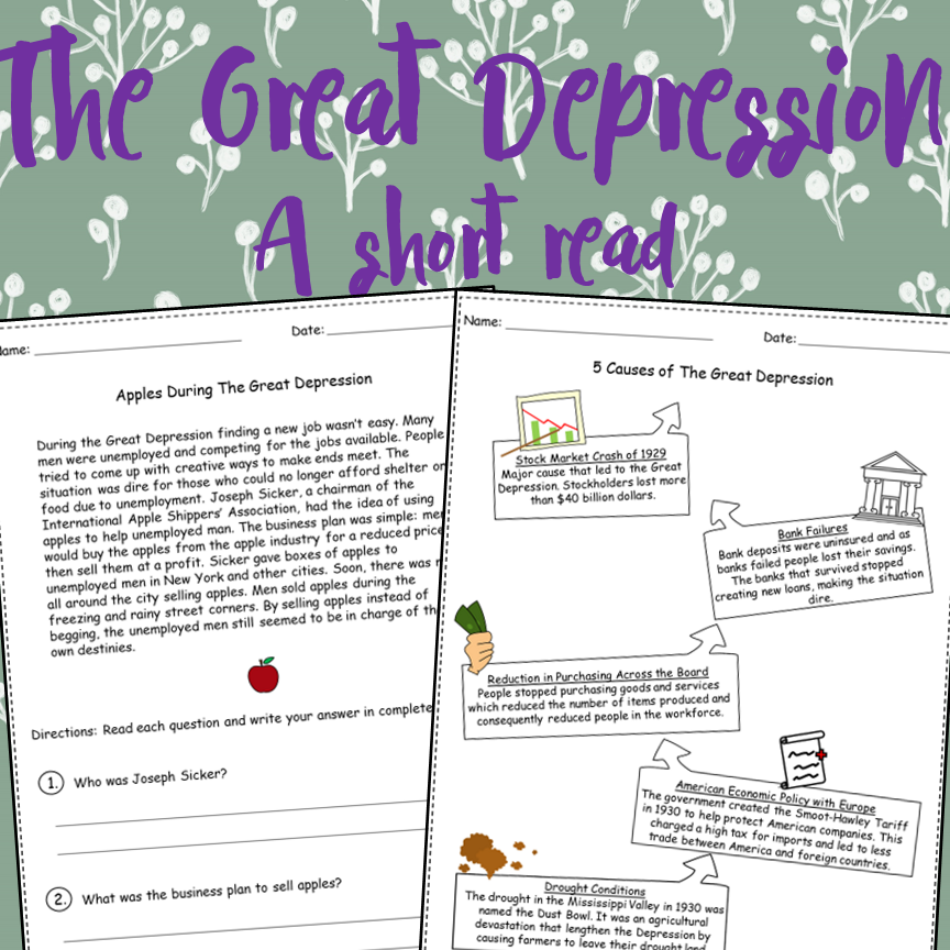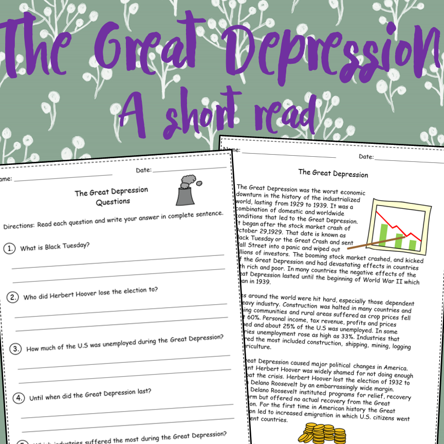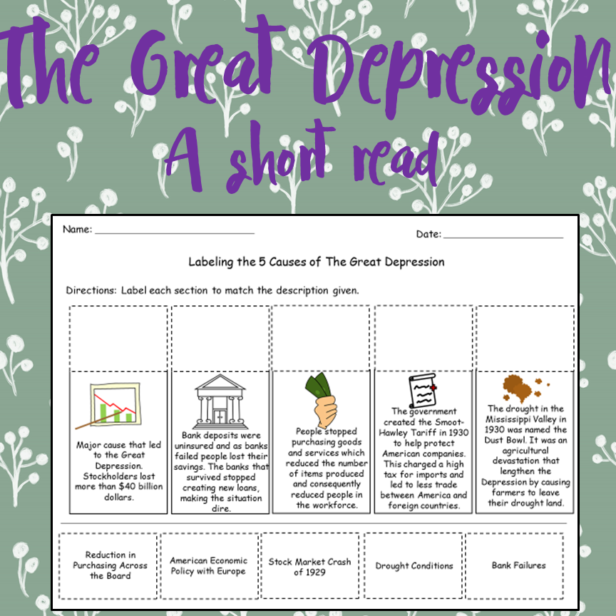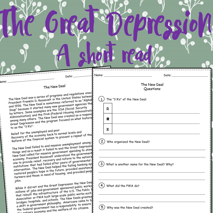 Students will examine the different problems and causes of the depression and what the New Deal meant to America. All the worksheets have graphics that will help students remember leading causes of the Great Depression.