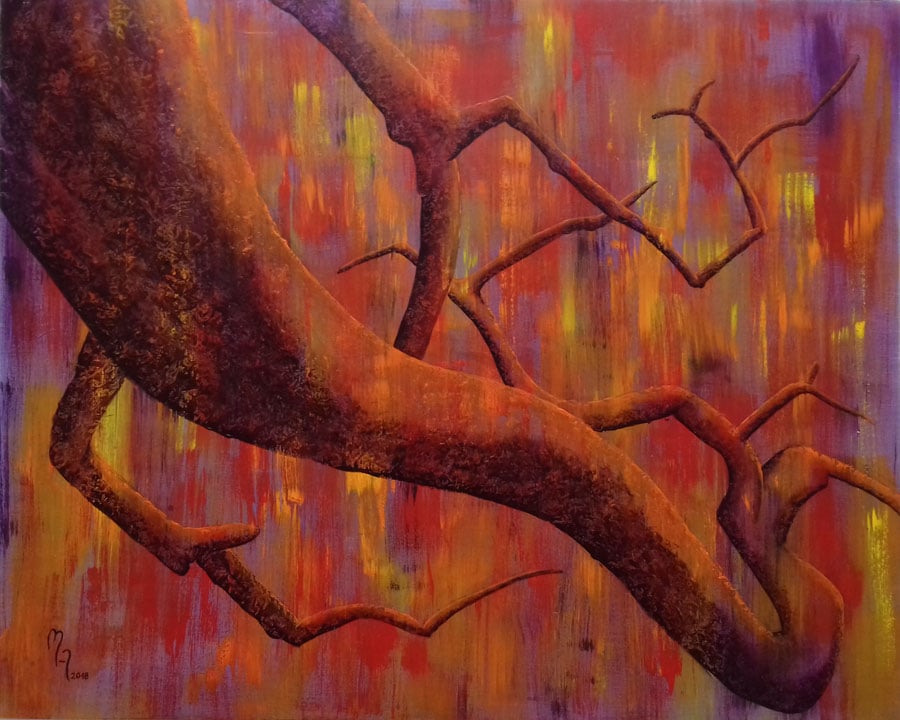 Burning Shadow captures the silhouette of a bare, winding tree branch set against an intense fiery backdrop. The bold interplay of deep blacks and glowing oranges evokes both the fierce power of a sunset and the quiet desolation of a landscape touched by flame.