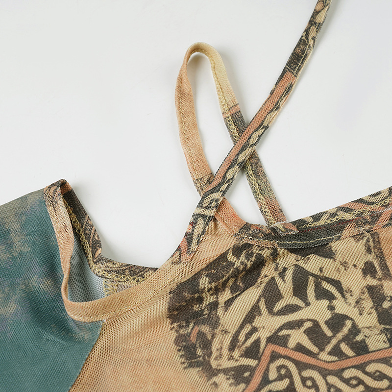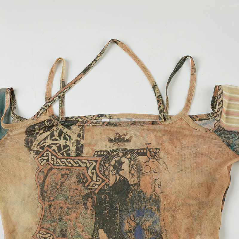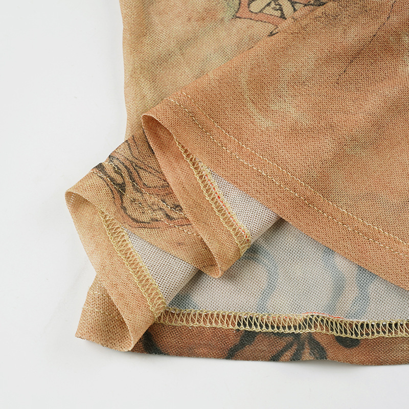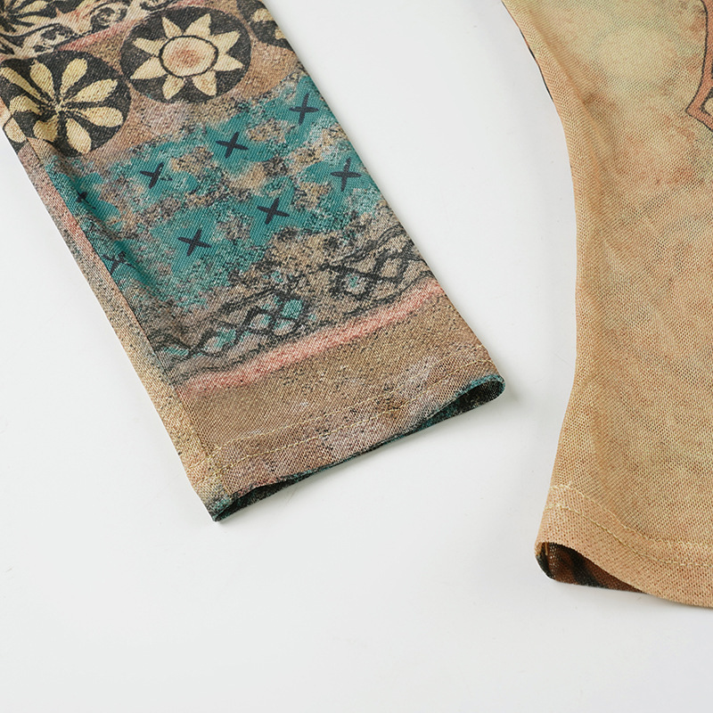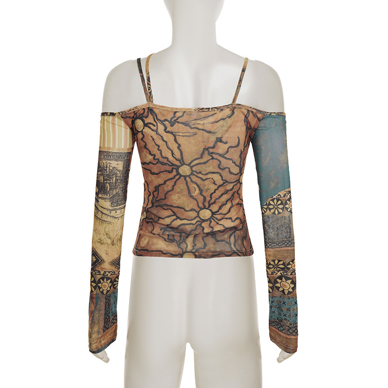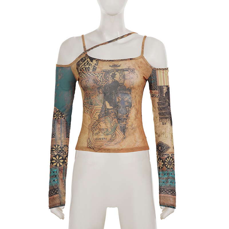 Designer subculture retro graffiti prints irregular slim mesh longsleeve T-shirt