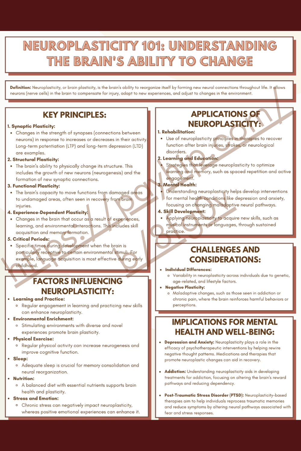 .This one-sheet provides a foundational overview of neuroplasticity, summarizing its key concepts and practical applications. Neuroplasticity is a fundamental property of the brain, providing the basis for learning, adaptation, and recovery. By understanding and harnessing neuroplasticity, individuals can improve cognitive function, enhance rehabilitation efforts, and promote overall brain health.