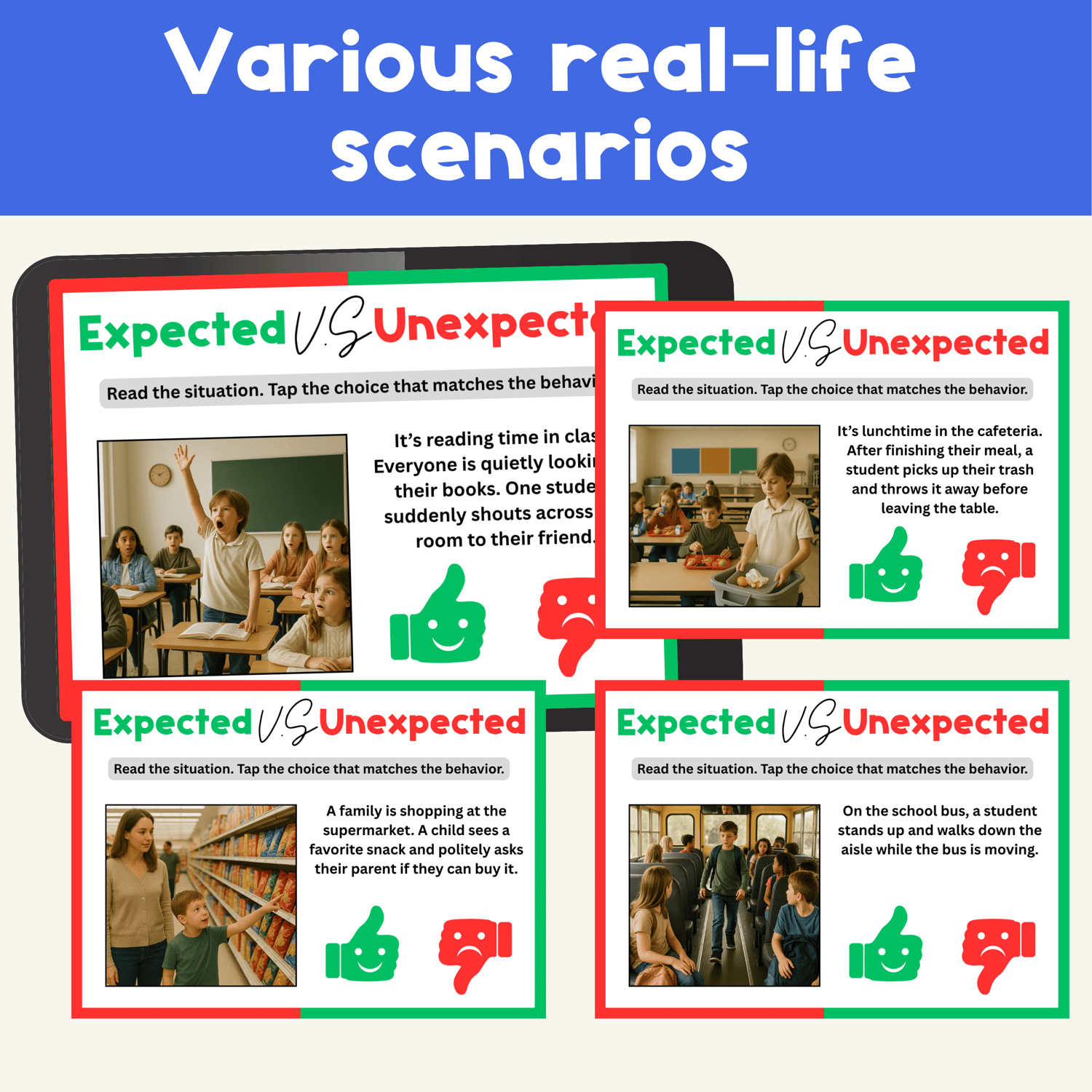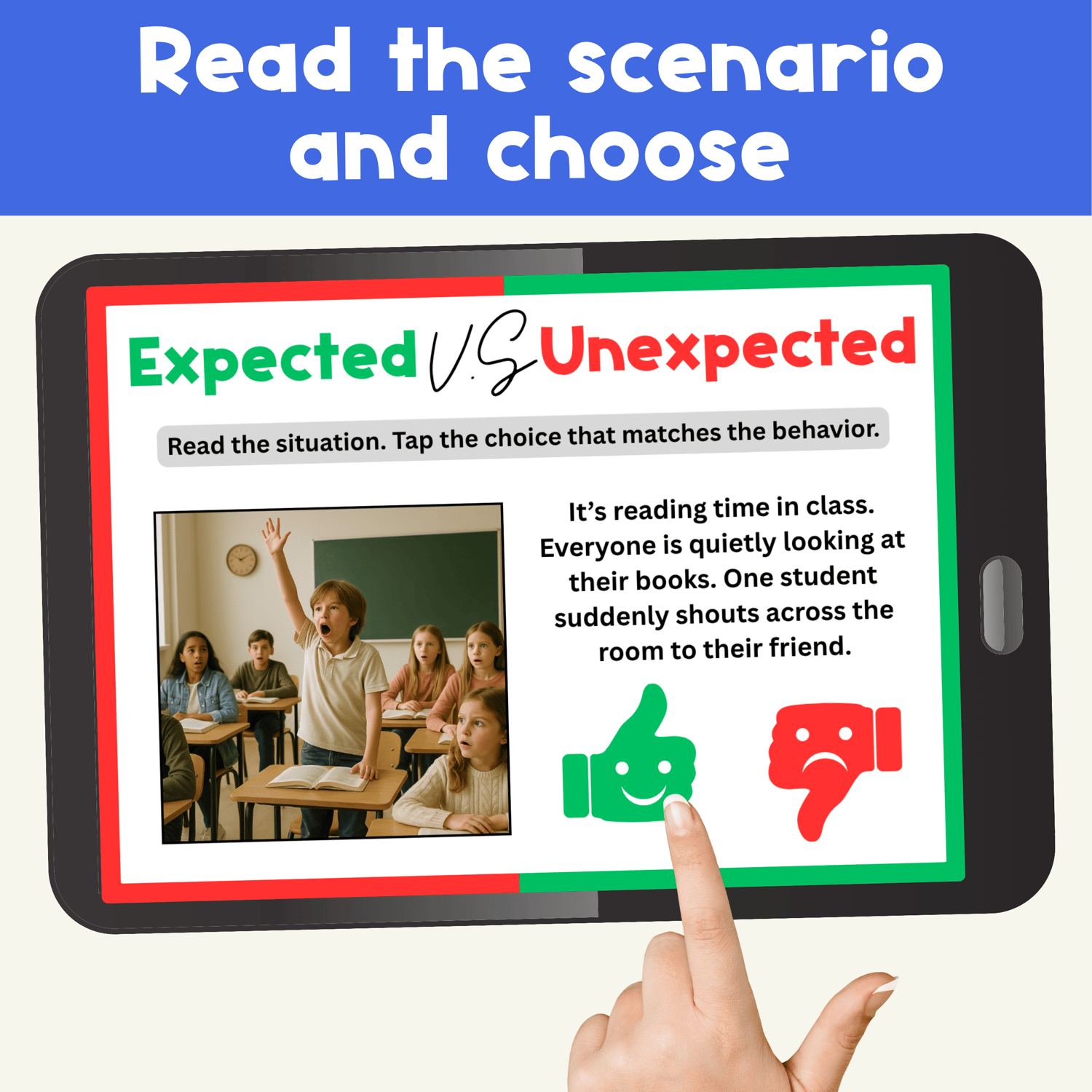 Students will read short scenarios and decide whether the behavior is expected or unexpected. Great for social-emotional learning, speech therapy, or classroom behavior lessons!