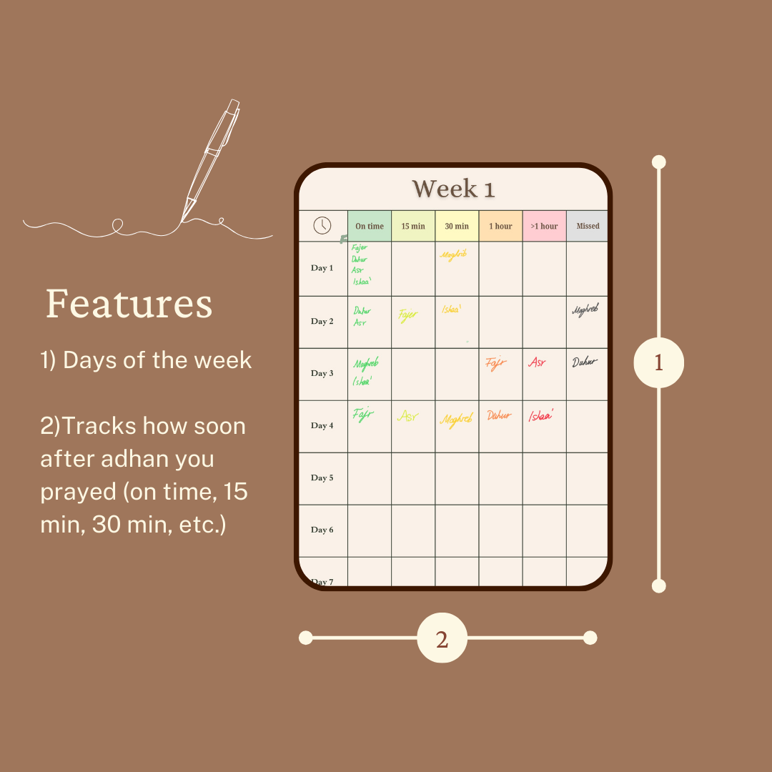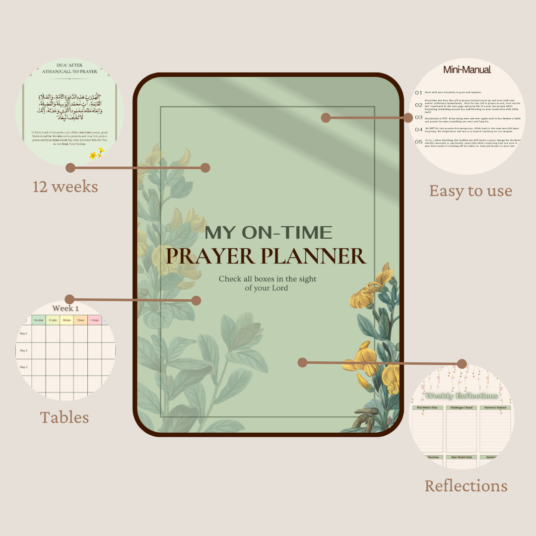 Stay mindful, organized, and connected with our On-Time Prayer Tracker. Designed for simplicity and aesthetic appeal, it features: