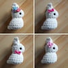 The Bunny Puff amigurumi pattern is no-sew, beginner friendly, and quick to work up. It’s similar to the squishy marshmallow Easter Peeps candy, but cuter and more 3D! This design can be crocheted with different yarn weights and fibers to create varying results, such as super bulky blanket or chenille yarn for a plush velvet look, and a medium weight yarn in acrylic or cotton for an even smaller keychain version.