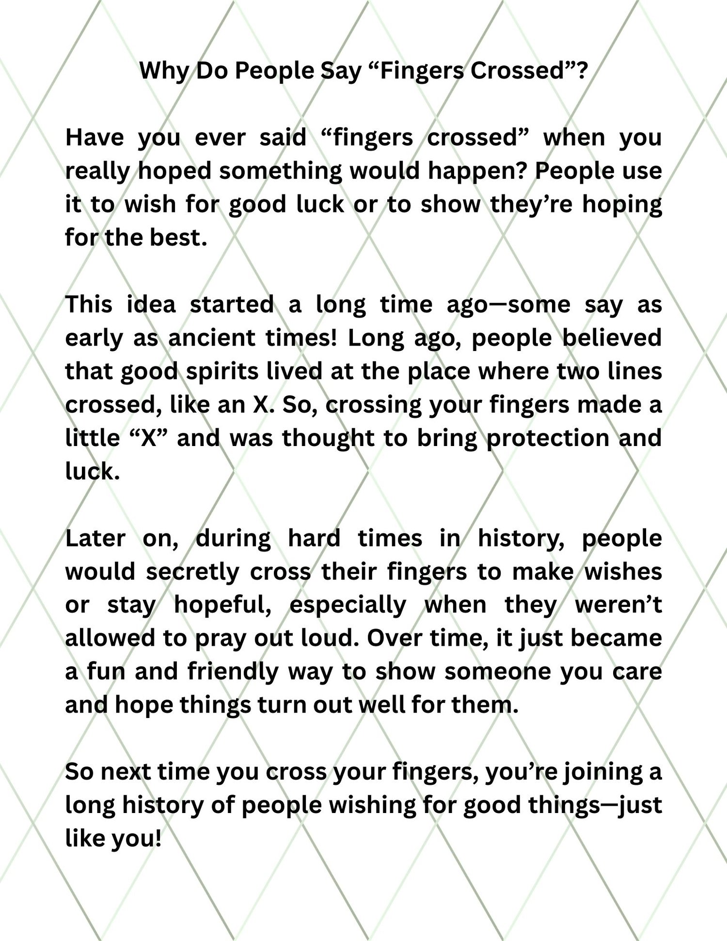 Each lesson includes a short reading passage, student worksheet, and answer key—making it perfect for morning work, bell ringers, brain breaks, sub plans, or full classroom discussions. These origin stories tie into cultural superstitions and common sayings that foster conversation and curiosity across age levels.