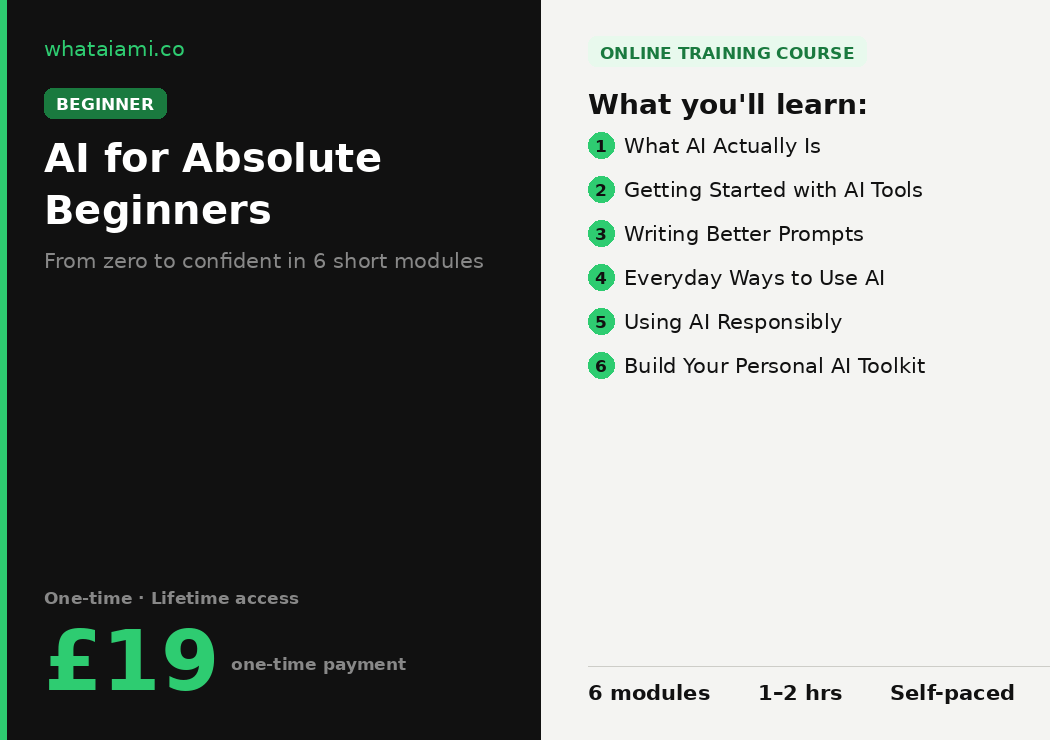 AI for Absolute Beginners takes you from zero to confident in six short modules. You'll learn what AI really is (without the jargon), get hands-on with the most useful tools, learn how to write prompts that actually work, and discover practical ways to use AI in your everyday life — at work, at home, and everything in between. By the end you'll have your own personal AI toolkit, a clear understanding of how to use AI responsibly, and the confidence to keep exploring. No tech background needed. Just curiosity.